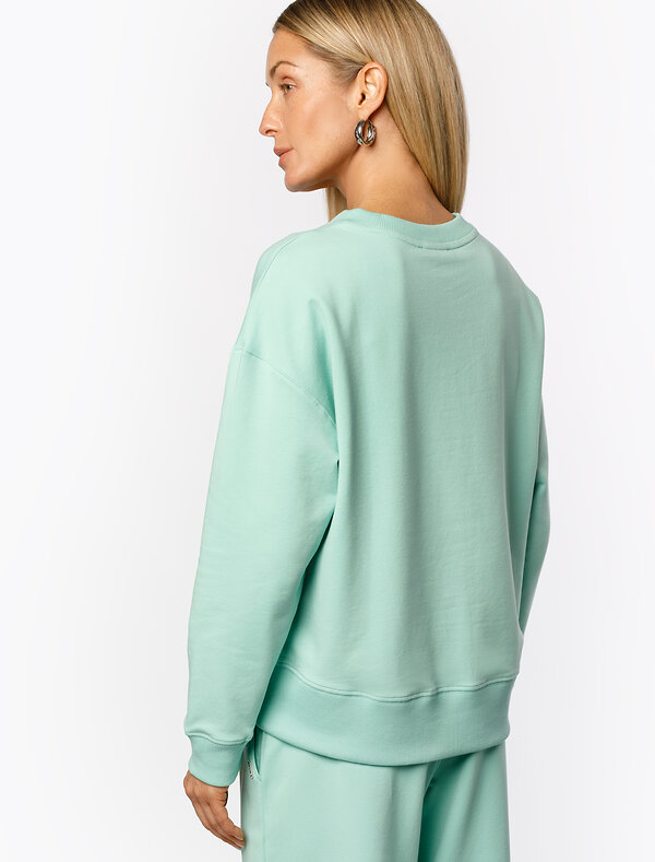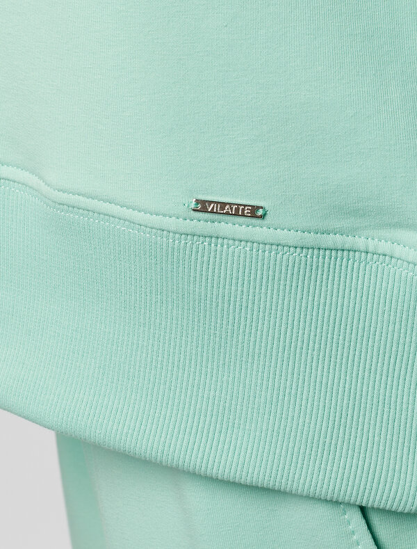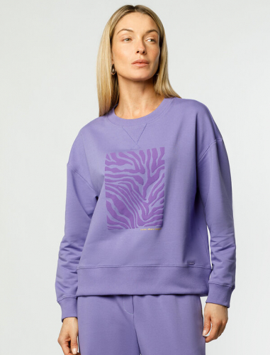 Перевод принта: Create, share, inspire - создавай, делись, вдохновляй. Джемпер среднего объема со спущенным плечом выполнен из футера двухнитки с эластаном. Принт нанесен фактурной краской. Эластичный материал гарантирует комфорт и формоустойчивость. Сочетается в костюме с брюками D44.138, D44.139 и шортами D48.008. Изделие дополнено металлическим логотипом бренда.