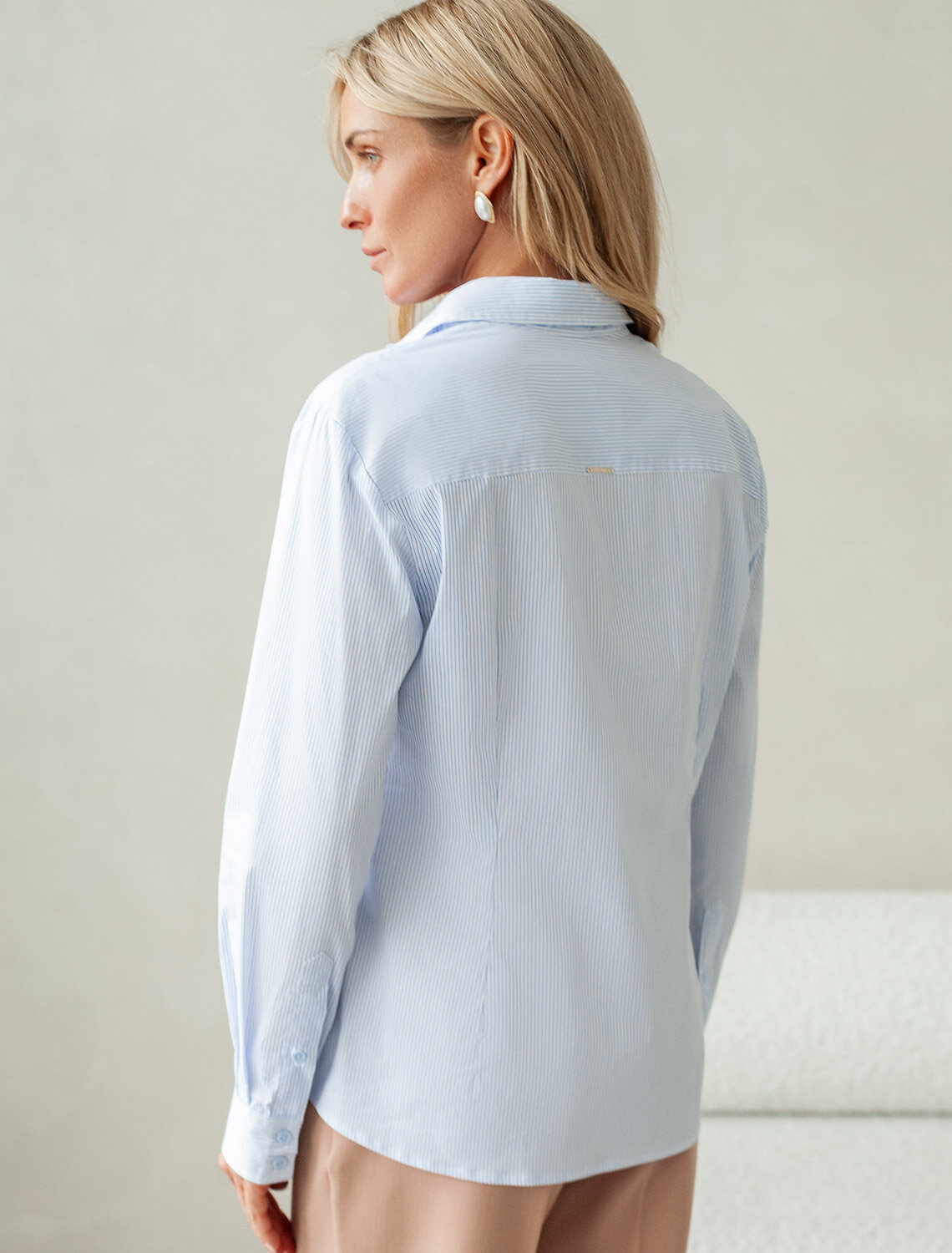 Блузка прилегающего силуэта выполнена из формоустойчивого хлопка. Фишкой изделия служат парные контрастные пуговицы. На спинке фирменный металлический логотип бренда. Изделие хорошо держит форму, подчеркивает силуэт и подходит для любой фигуры. Идеальный вариант для респектабельных образов в деловом стиле.