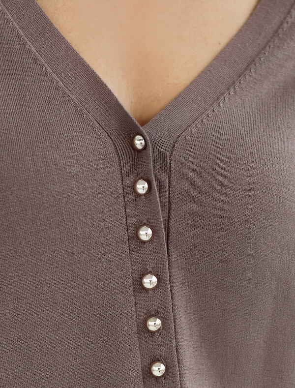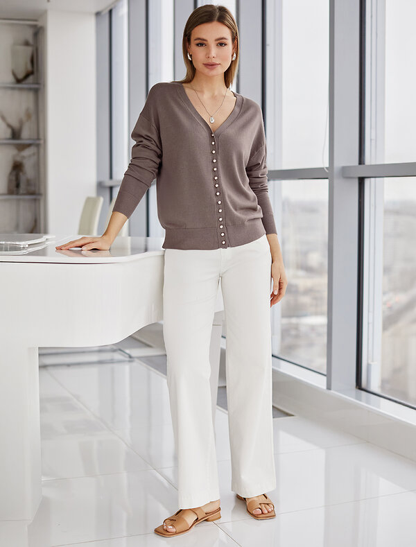 Кардиган тонкой вязки выполнен из нежной пряжи вискозы с нейлоном. Лаконичный силуэт дополнен яркой фишкой изделия - ряд золотистых пуговиц, визуально вытягивающий силуэт. Очень приятное к телу изделие, в котором будет не жарко даже в самые теплые дни. Изделие дополнено логотипом бренда.
