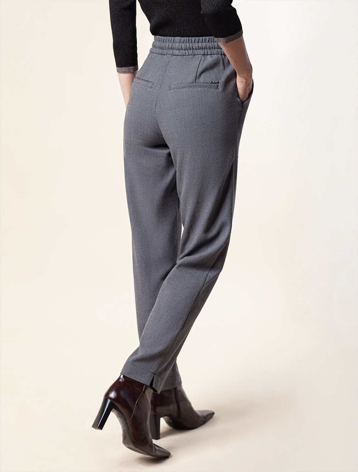Брюки-бананы выполнены из фактурной поливискозы с добавлением нити эластана. Материал хорошо пропускает воздух, поэтому в изделии не будет жарко даже в отопительный сезон. Комфортная посадка на талии с поясом из эластичной резинки с дополнительными шнурками, позволяют фиксировать модель без ремня. Изделие со стрелками и двумя боковыми карманами, одним карманом в листочку сзади. Брюки-бананы отлично подходят обладательницам фигуры песочные часы, а также женщинам с узкими бедрами помогут уравновесить пропорции.