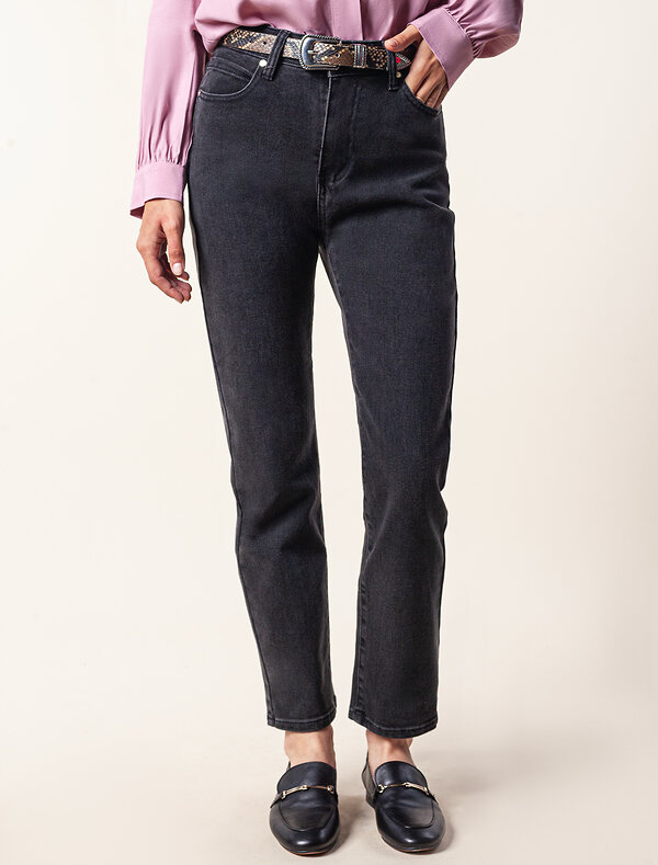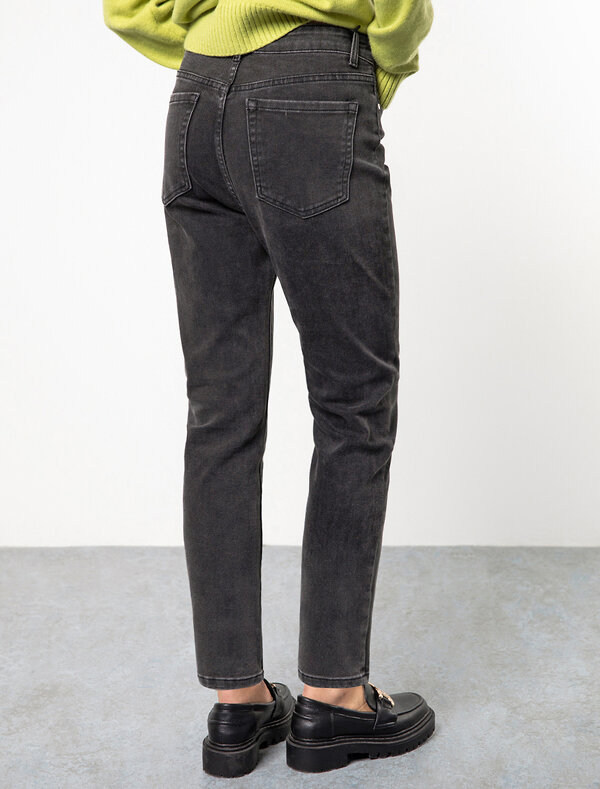 Темно-серые джинсы из плотного прочного хлопка с добавлением нитей эластана. Укороченная модель изящно открывает лодыжки. Высокая посадка грамотно подчеркивает силуэт. Данная модель легко и безупречно поможет составить модный образ вместе с трикотажным поло, свободной блузкой, футболкой или жакетом.