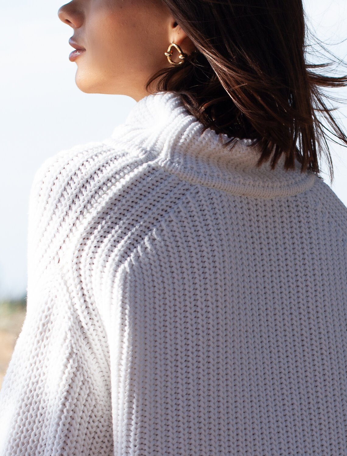 Свободный свитер с высоким воротником белоснежного оттенка. Модель со спущенной линией плеч выполнили крупной фактурной вязкой из мягкого хлопка с акрилом Изделие из такой пряжи получилось невероятно теплым и приятным на ощупь. Подходит для любого типа фигуры.
