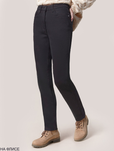 Черные прямые джинсы выполнены из эластичного денима. Внутренняя сторона изделия утепленная мягким флисом обеспечит тепло, комфорт и защиту от холода. Удлиненная модель с классической посадкой на талии визуально вытягивает силуэт. Лучший вариант для зимнего периода, когда хочется выдержать стиль и практичность.