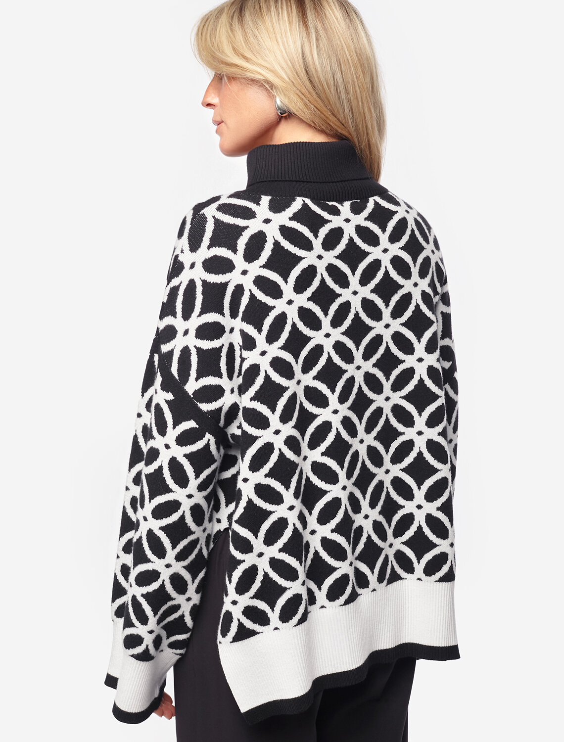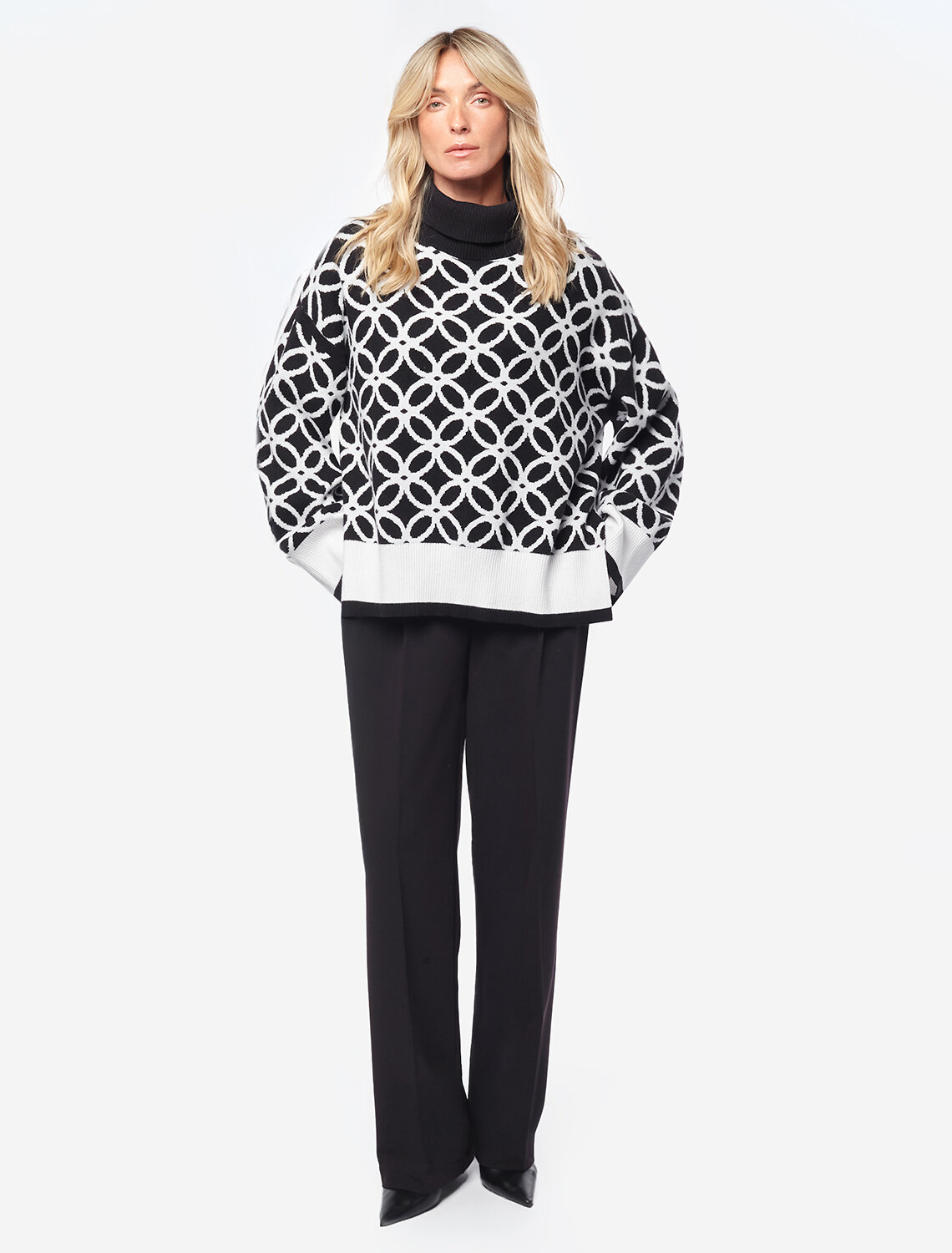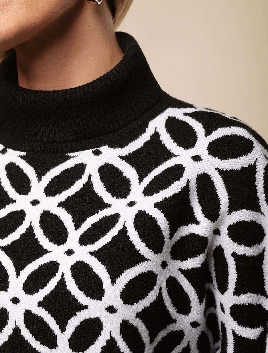 Свитер жаккардовой вязки выполнен из нежной пряжи на основе вискозы с добавлением кашемира. Свободная модель со спущенным плечом дополнена боковыми разрезами, что делает образ еще более расслабленным. Совет стилиста: такой джемпер может стать ключевым акцентом в сдержанном комплекте. Выбирайте однотонные низы в тон широкой рибаны или на контрасте.
