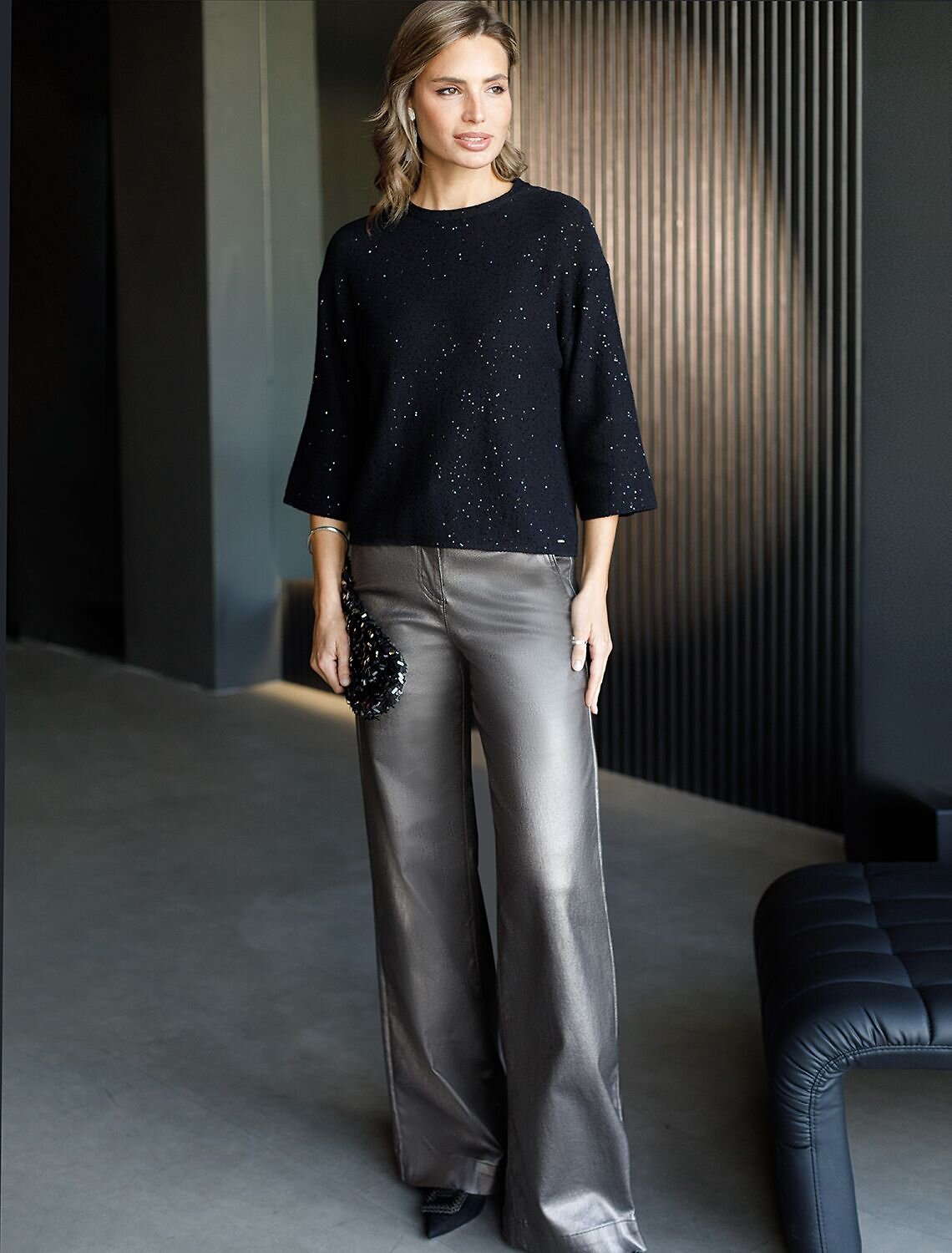 Легкий джемпер черного цвета с рукавом три четверти выполнен из хлопковой пряжи с вкраплением сияющих пайеток, что придает особую изысканность. Стильный джемпер связан изнанкой, пряжа отличается легкостью и приятной текстурой, совершенно не колется, обеспечивает комфорт даже при длительном использовании, а натуральные волокна поддерживают оптимальный температурный баланс. Крой полуприлегающий, подчеркивает женственный силуэт, а круглый ворот и спущенная линия плеча гармонично завершают дизайн, создающий аккуратный образ. Нарядный джемпер подойдет девушкам и женщинам больших размеров, в нем вы будете чувствовать себя уверенно и свободно в любой ситуации. Мерцающий эффект пайеток добавляет образу выразительности и индивудуальности. Сочетайте джемпер в романтическом образе с пышной юбкой, в более строгом с широкими брюками. Мерцающее полотно добавляет особого шарма вашему образу, делая его уместным как на праздник, так и для повседневного выхода. Новый год, вечеринка или любое другое мероприятие пройдут ярко