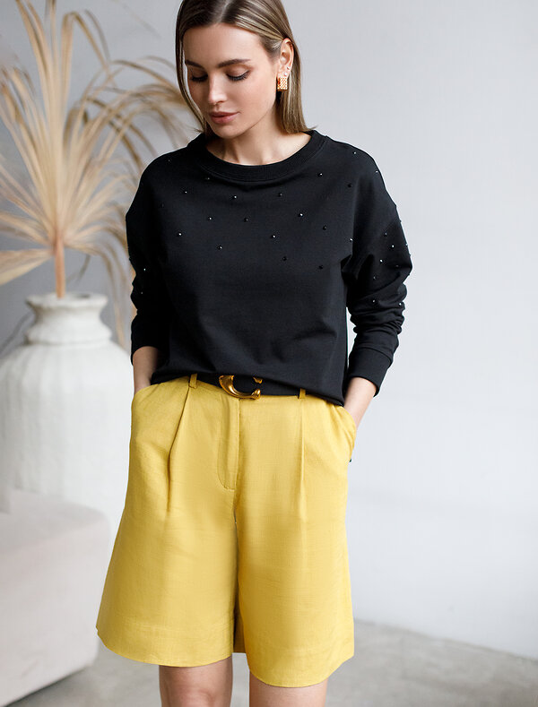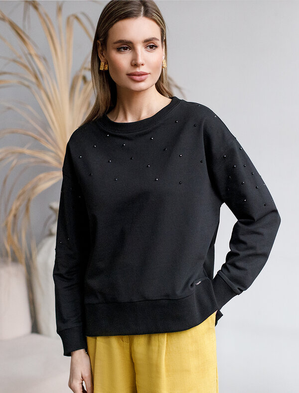 Свитшот выполнен из эластичного футера двухнитки. Изделие дополнили лаконичным принтом стразами в тон изделия. Расслабленный стиль поддерживает спущенная линия плеча, свободный силуэт и разрезы по бокам. Модель сочетается в костюме с брюками D44.135, D44.136, D44.137 и юбкой D46.034