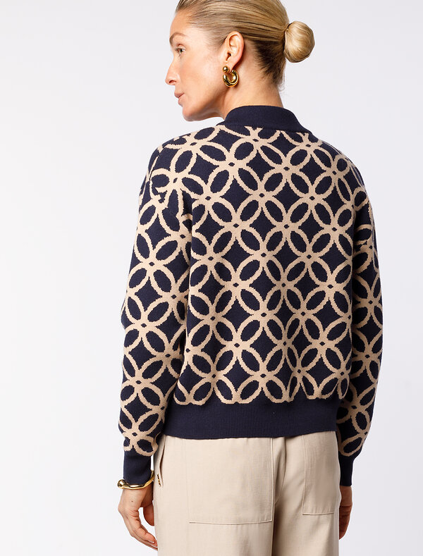 Бомбер жаккардовой вязки выполнен из нежной пряжи на основе вискозы с добавлением кашемира. Мягкая модель с золотистой фурнитурой не раздражает кожу, приятно ощущается на теле и поддерживает комфортный микроклимат. Совет стилиста: трендовая модель эффектно впишется в сдержанный образ, добавив образу выразительности. Сочетайте с однотонными брюками, юбкой, платьем или джинсами