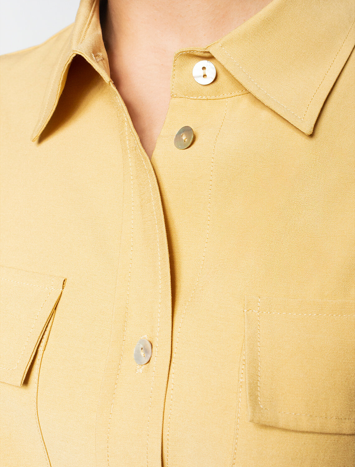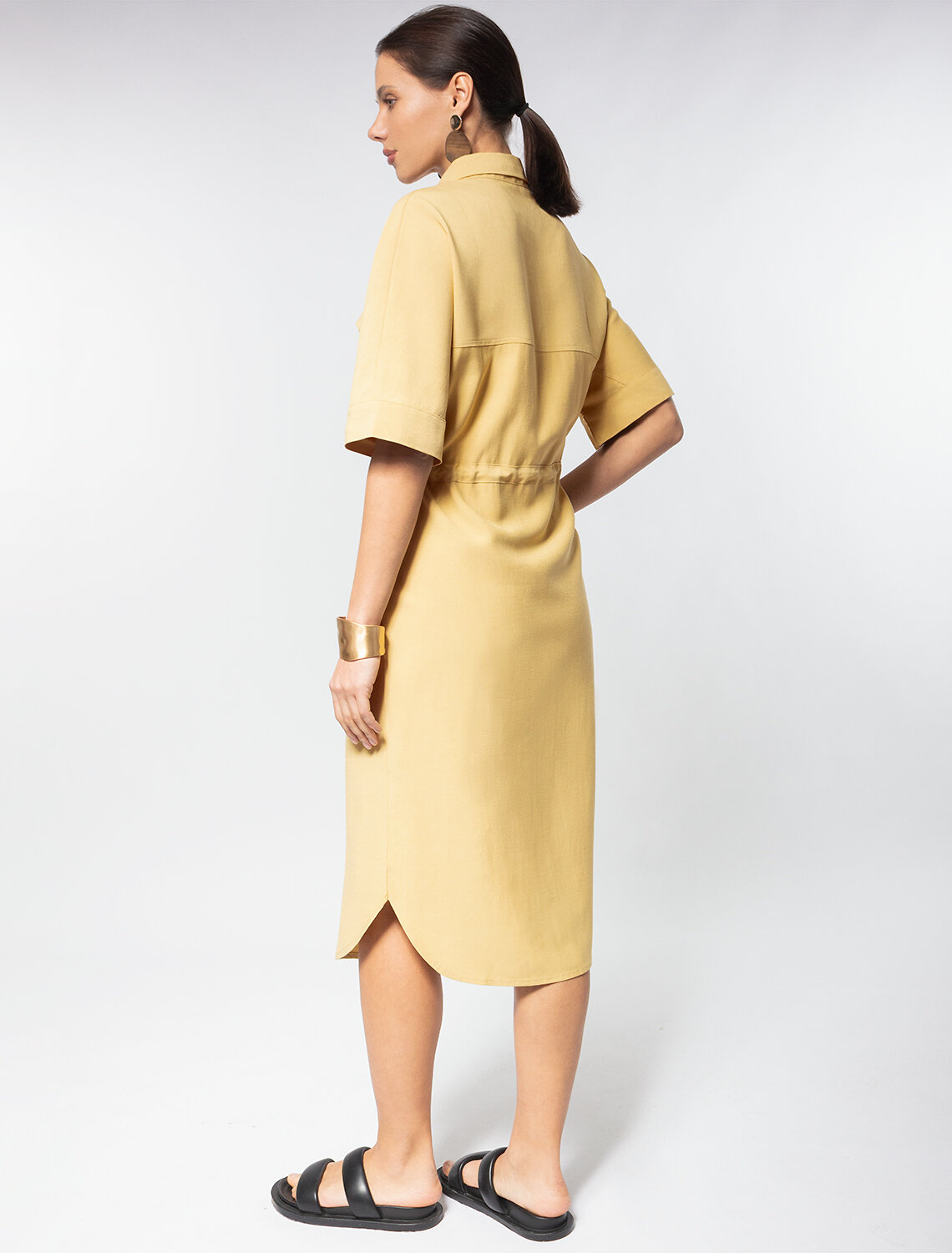 Платье-рубашка выполнено из плотного лиоцелла. Модель дополнена двумя накладными карманами в стиле сафари с пуговицами из натурального перламутра. Свободный силуэт не сковывает движений. Талия подчеркнута регулируемым поясом-шнуром. По бокам разрезы. Добавление синтетических волокон в составе изделия предотвращает сминаемость. Изделие сохранит свой безупречный внешний вид в течении долгого времени.