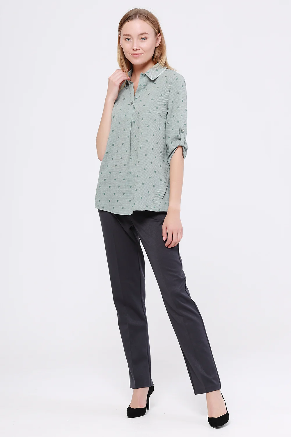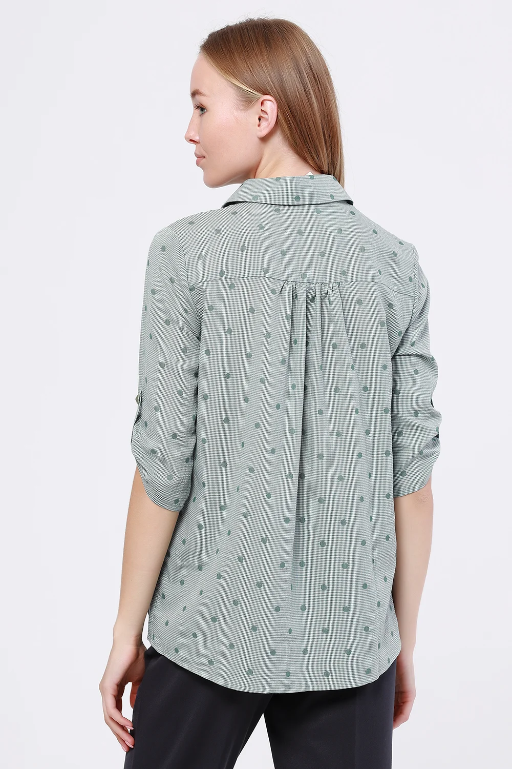 Блузка свободного покроя. на спинке кокетка. Воротник отложной на стойке.Рукав 3/4 с патом. На планке застежка на пуговицу.Декоративный элемент на передней полочке.