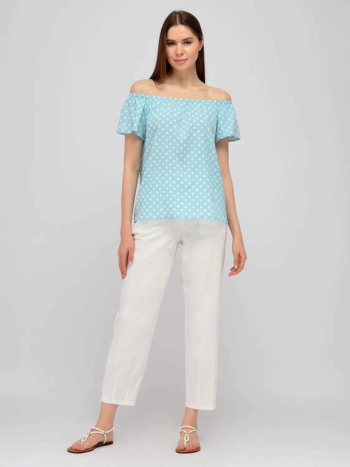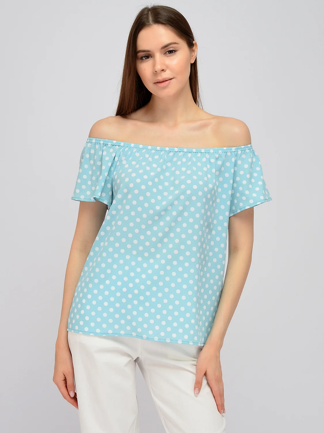 Блузка с открытыми плечами свободного силуэта. Верх на резинке. Рукав короткий.