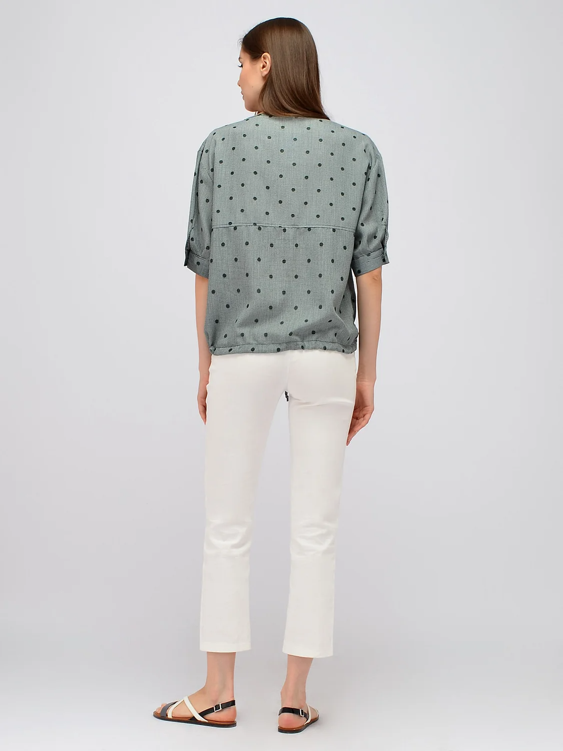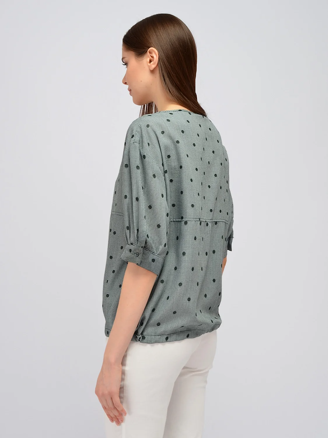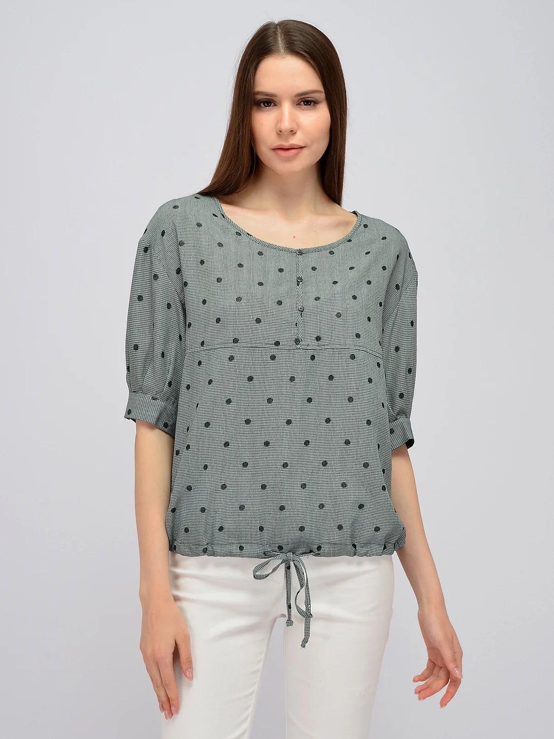 Прямая блузка свободного силуэта гармонично дополнит Ваш весенний гардероб. В составе блузки хлопок, благодаря чему Вы будете чувствовать себя комфортно в жаркую погоду. Округлая горловина и укороченный рукав до локтя создают мягкий женственный образ. Декоративные пуговицы и кулиска придадут Вашему образу романтичности. Прямая блузка с кулиской поможет завершить офисный или повседневный образы.