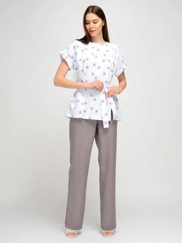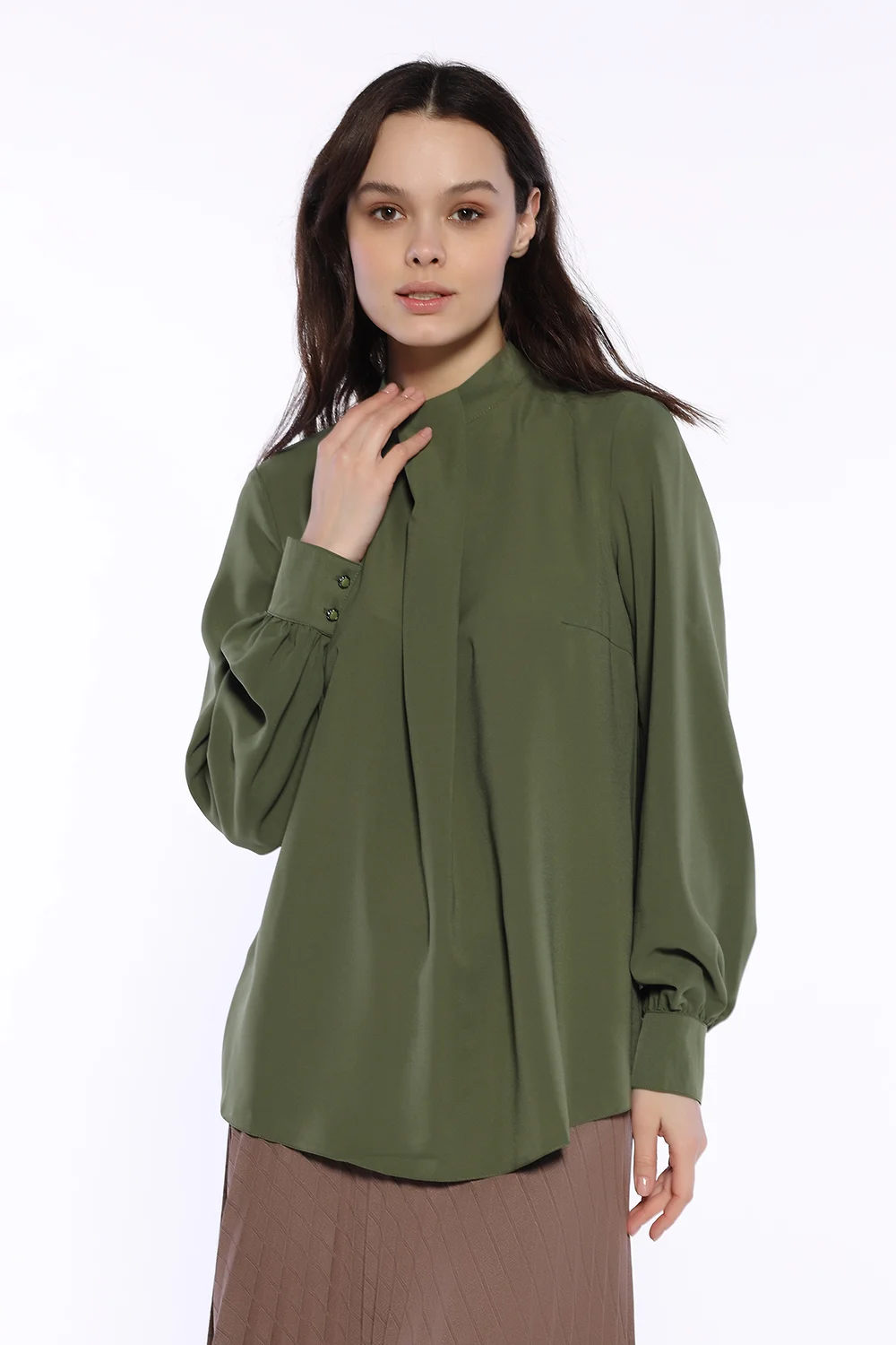 Блузка женская прямого силуэта.Рукав длинный на манжете. Воротник-стойка с застежкой на пуговицы. На передней полочке декоративная складка.