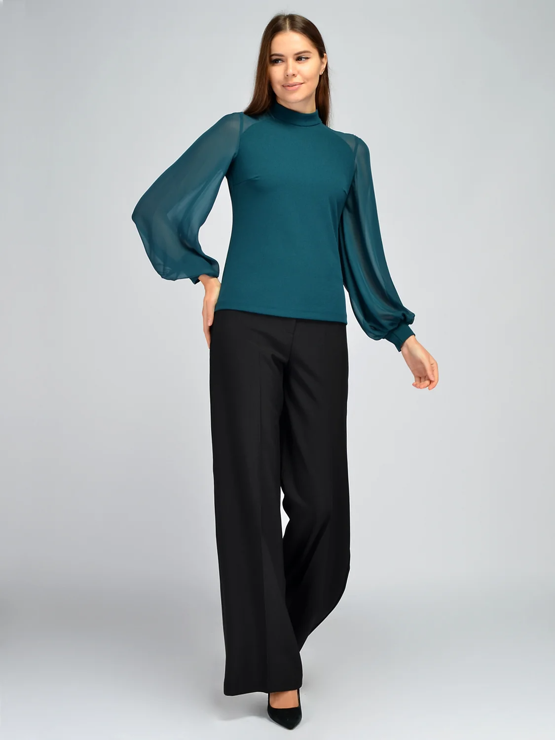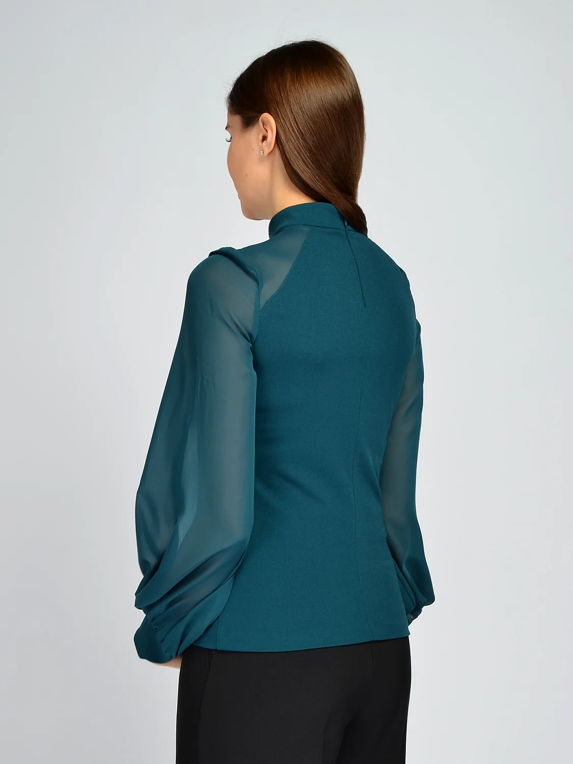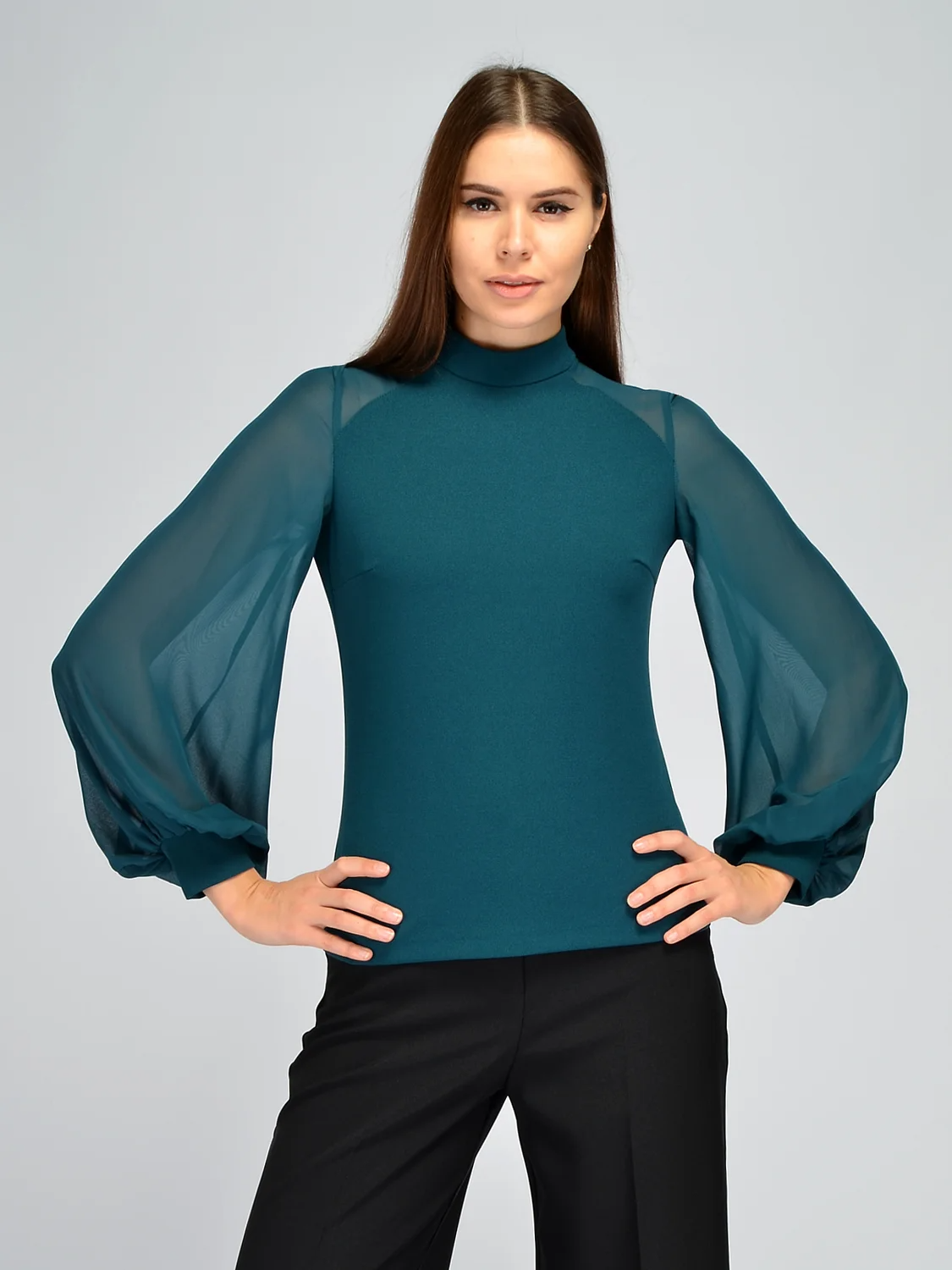 Эффектная блузка с полупрозрачными рукавами никого не оставит равнодушным. Блузка имеет аккуратный воротник-стойку, защищая шею от ветра и холода в осенне-зимний период. Приталенный облегающий крой подчеркнет фигуру, но не будет акцентировать внимание на ее особенностях, поскольку изделие выполнено из качественной плотной ткани. Кофточка прекрасно сядет на любую фигуру и подойдет дамам с разными формами, поскольку на груди предусмотрены вытачки. Главное притягательной особенностью модели, безусловно, являются свободные шифоновые рукава фонарики. Они не облегают руки, не стесняют движений, скрывают возможные нюансы и, тем временем, создают яркий броский акцент. Блузка с длинным рукавами прекрасно впишется в нарядные образы для праздников или культурных мероприятий. Вечерняя блузка сочетается с классическими брюками и юбками, а выбор обуви зависит от Ваших планов и индивидуальных предпочтений. Создайте запоминающийся образ, в котором \вы будете чувствовать себя привлекательно и уверенно!