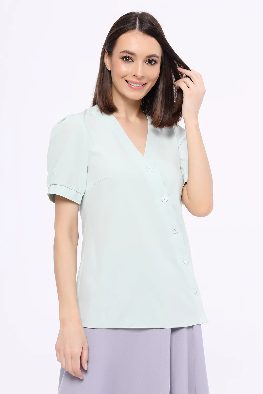 Лаконичная прямая блузка с коротким рукавом формы фонарик - неотъемлемая часть весенне-летнего гардероба. Свободный фасон блузки и лёгкий материал позволят Вам чувствовать себя комфортно в тёплую погоду. Блузка имеет ассиметричную застёжку на пуговицы, что прибавляет образу романтичности.