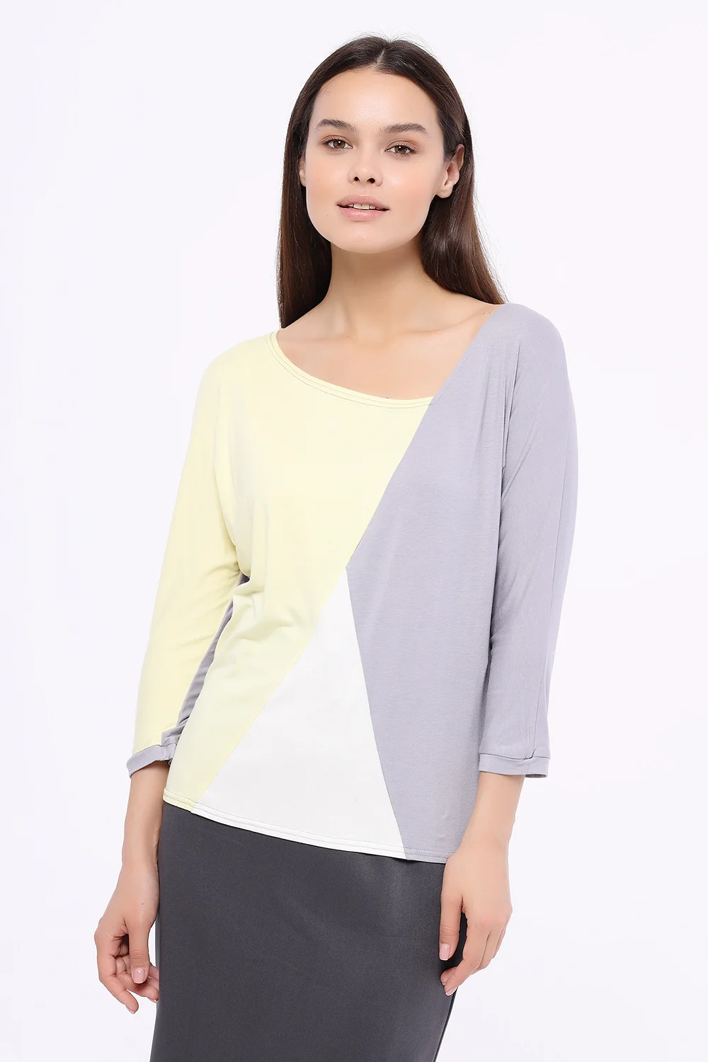 Стильная блузка с укороченным рукавом станет незаменимым элементом Вашего гардероба. Эффектный фигурный вырез будет привлекать к себе внимание, приоткрывая ключицу. Оригинальный герметичный принт составлен из трёх цветов, образуя треугольник на центральной части и визуально сужает силуэт.