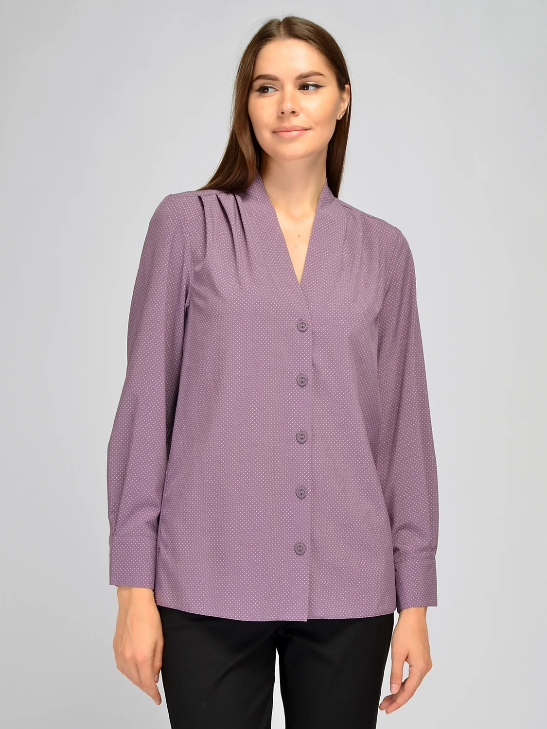 Прямая блузка с Vобразным вырезом и длинными рукавами. Дополняй любимые образы лаконичной блузкой прямого кроя. На передней части блузки на плечах располагаются декоративные складки. Неглубокий вырез деликатно приоткрывает ключицу и добавляет образу женственности. Vобразный вырез. Без отделки горловины. Без воротника. Рукава длинные. Рукава втачные. Вид застежки пуговицы. Крой прямой. Рекомендована стирка при температуре не более 30С.Универсальная блузка выполнена в нескольких расцветках, что позволит Вам создать образ под разное настроение и повод. Завершите деловой стиль строгой расцветкой, юбкой или брюками и закрытой обувью на высоком ходу. Дополните повседневный образ удобными брюками и комфортной обувью на низком ходу. Носите блузку заправленной за пояс.