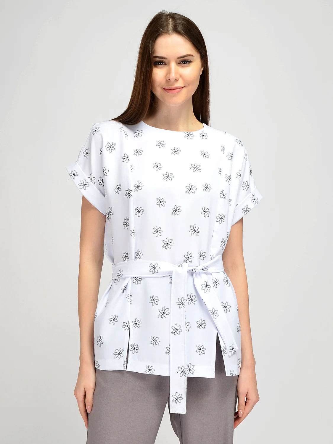 Летняя блузка с поясом свободного кроя дополнит стильный повседневный гардероб. Базовая однотонная блузка с короткими рукавами имеет вертикальные вытачки, чтобы блузка идеально села в области груди. Короткие рукава имеют небольшие отвороты на манжетах. Классическая деловая летняя блузка комплектуется поясом в цвет изделия, который подчеркнет талию и сделает силуэт утонченным. На передней части летней кофточки располагаются небольшие разрезы, что придает всему образу оригинальности. Однотонная свободная блузка застегивается на потайную молнию, которая находится на спине. Лаконичная базовая блузка придется по вкусу взрослым женщинам, молодым девушкам, а также будущим мамам. Удлиненная блузка скроет возможные недостатки фигуры, при этом подчеркивая ее достоинства. Офисная летняя блузка сочетается с брюками, юбками и даже джинсами. Выбирайте обувь исходя из повода. Это могут быть туфли-лодочки, босоножки или кеды. Подчеркните свою индивидуальность, выбрав стильную кофточку с коротким рукавом, поясом и разрезами.