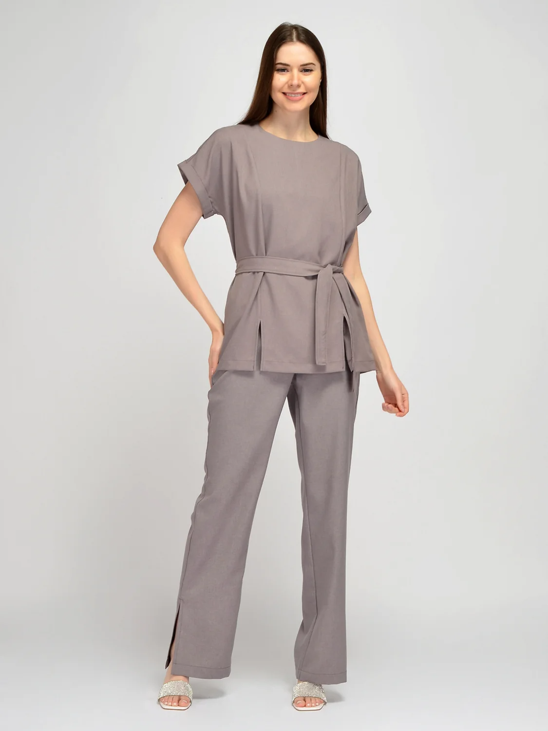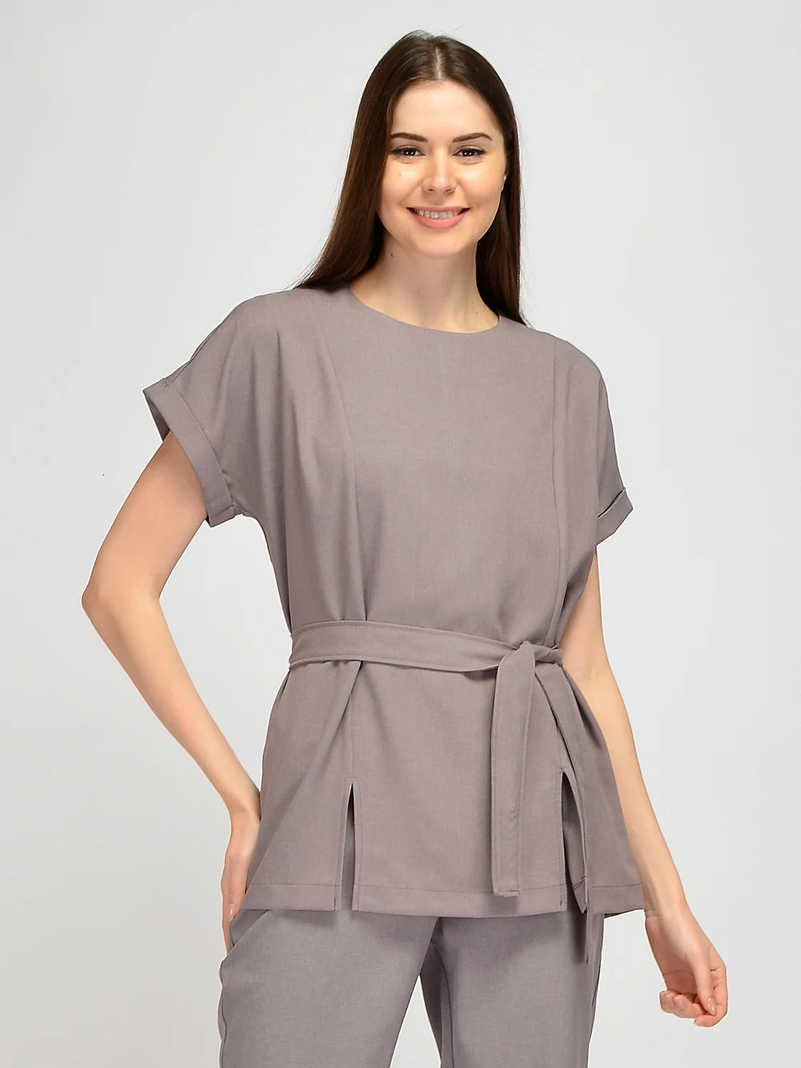 Летняя блузка с поясом свободного кроя дополнит стильный повседневный гардероб. Базовая однотонная блузка с короткими рукавами имеет вертикальные вытачки, чтобы блузка идеально села в области груди. Короткие рукава имеют небольшие отвороты на манжетах. Классическая деловая летняя блузка комплектуется поясом в цвет изделия, который подчеркнет талию и сделает силуэт утонченным. На передней части летней кофточки располагаются небольшие разрезы, что придает всему образу оригинальности. Однотонная свободная блузка застегивается на потайную молнию, которая находится на спине. Лаконичная базовая блузка придется по вкусу взрослым женщинам, молодым девушкам, а также будущим мамам. Удлиненная блузка скроет возможные недостатки фигуры, при этом подчеркивая ее достоинства. Офисная летняя блузка сочетается с брюками, юбками и даже джинсами. Выбирайте обувь исходя из повода. Это могут быть туфли-лодочки, босоножки или кеды. Подчеркните свою индивидуальность, выбрав стильную кофточку с коротким рукавом, поясом и разрезами.