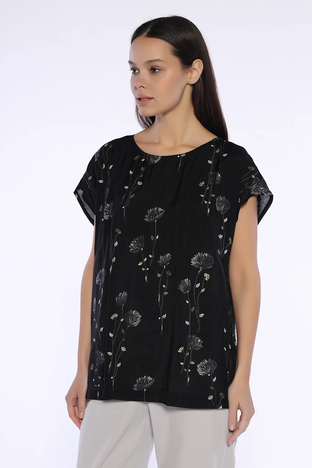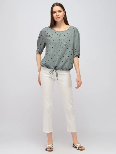 Летняя блузка оверсайз станет важной частью Ваших образов в жаркий сезон. Свободная округлая горловина не давит и позволяет изящно обыграть шею различными шейными украшениями. Короткие цельнокроеные рукава не облегают руки и не сковывают движений. Удлиненная кофточка имеет декоративные разрезы по бокам. Вы можете носить ее навыпуск или заправленной за пояс. Стильная блузка с коротким рукавом выполнена из легкой струящейся наощупь вискозы. Летняя блузка из вискозы обеспечит прохладу даже в знойный сезон, и Вы будете чувствовать себя уверенно и комфортно на протяжении всего дня. Блузку с принтом Вы можете носить на работу в офис, на прогулку, на свидание или на торжественное мероприятие. Сочетайте кофточку с комплектными брюками из нашей коллекции, юбкой или шортами. Обувь и аксессуары выбирайте исходя из повода и события. Это могут быть классические и строгие элементы или наоборот повседневные в стиле кэжуал. Базовая летняя блуза подойдет как взрослым женщинам, так и молодым девушкам, а благодаря широкому прямому крою ее по достоинству оценят будущие мамы.