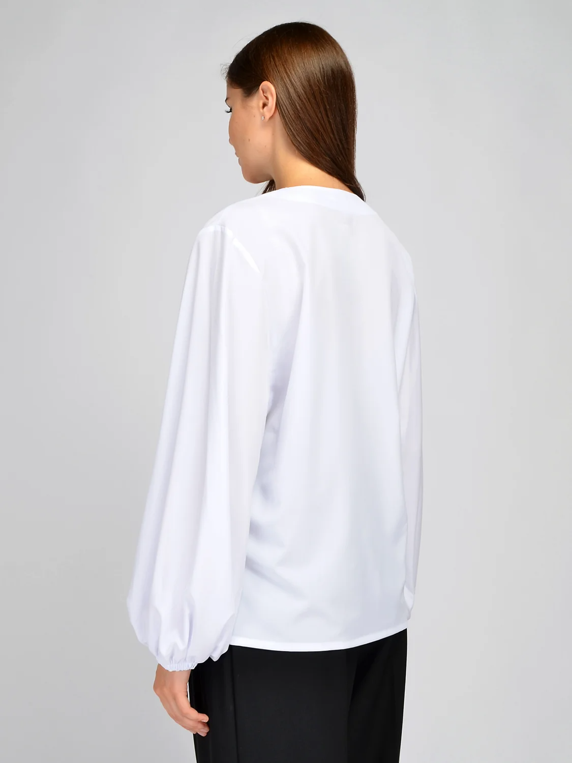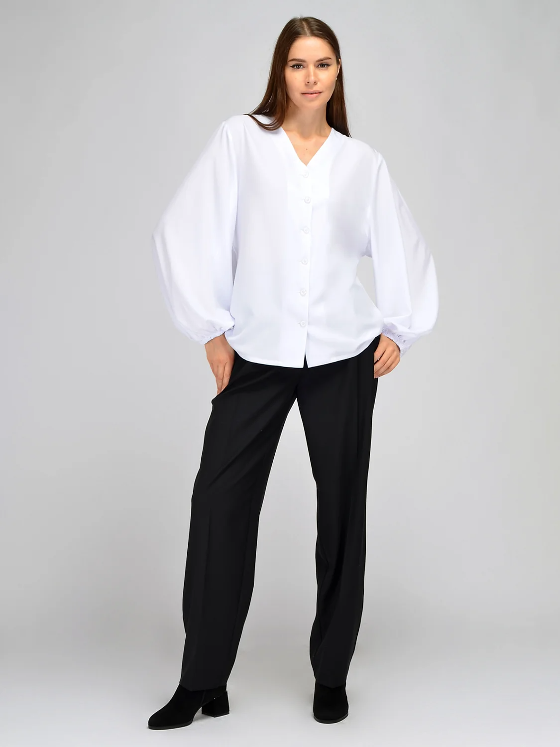 Свободная блузка с объемными рукавами придаст элегантности Вашим образам в любое время года. Изящный V-образный вырез горловины приоткрывает ключицу и позволяет интересно обыграть линию декольте шейными украшениями. Блузон застегивается на пуговицы. Широкие рукава являются главной особенностью модели. Их обрамляет нетугая резинка со складками, создавая эффект воздушности. Приталенная рубашка легко впишется в строгие, офисные или вечерние, нарядные образы. Универсальный фасон подойдет как взрослым женщинам, так и молодым девушкам, и подросткам для школы. Просторный крой поможет скрыть возможные недостатки фигуры. Если сочетать блузку с брюками или юбкой с высокой посадкой и заправить ее за пояс, Вы создадите утонченные пропорции фигуры, делая ноги еще длиннее. Классическая базовая блуза сочетается не только со строгим низом и обувью. Вы можете создать стильный образ для свидания или вечеринки, выбрав в качестве поясного изделия джинсы и дополнив образ туфлями-лодочками контрастного цвета. Не забудьте завершить свои образы украшениями и аксессуарами!