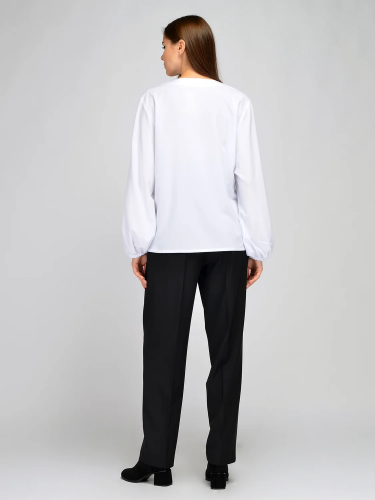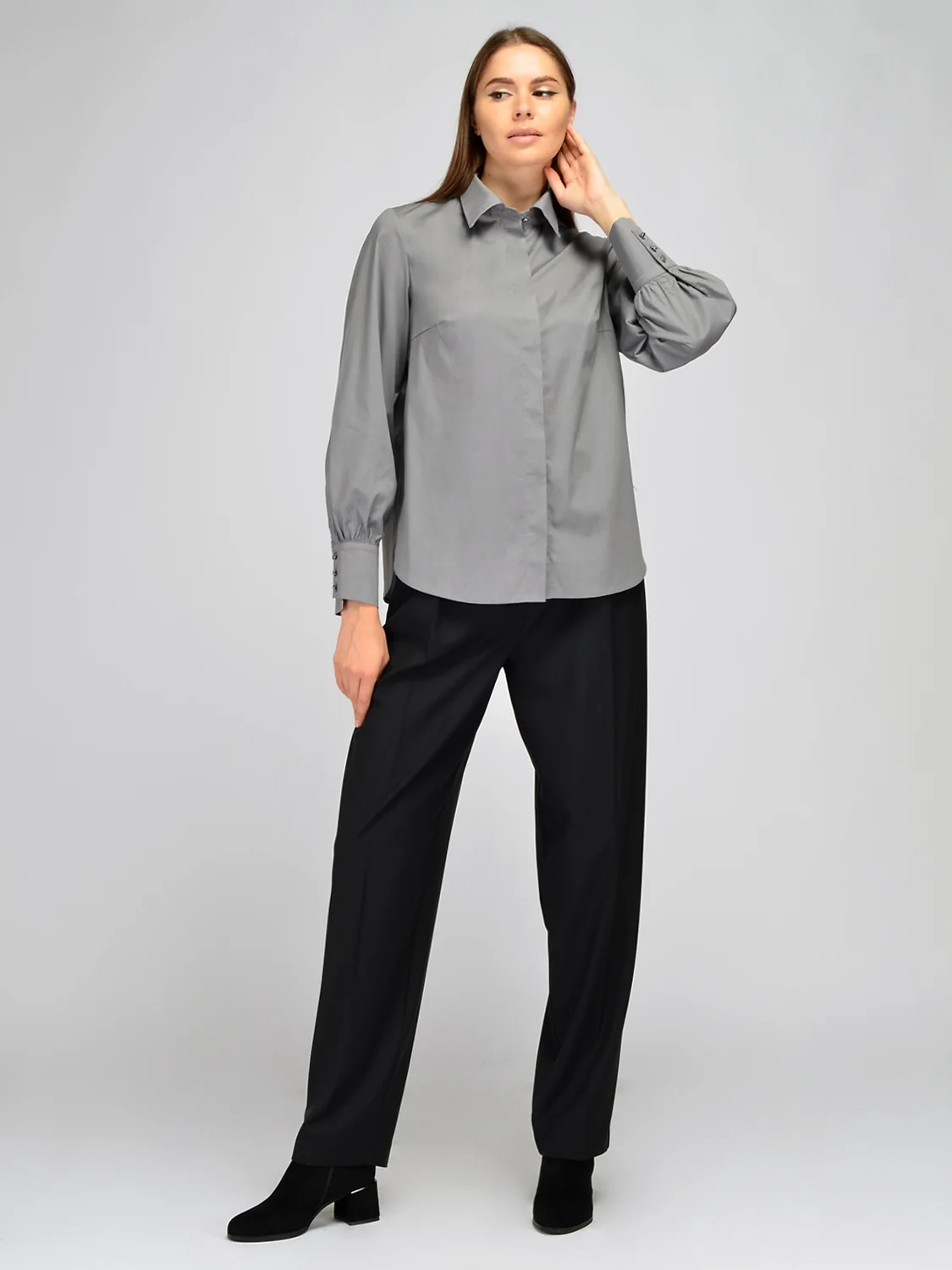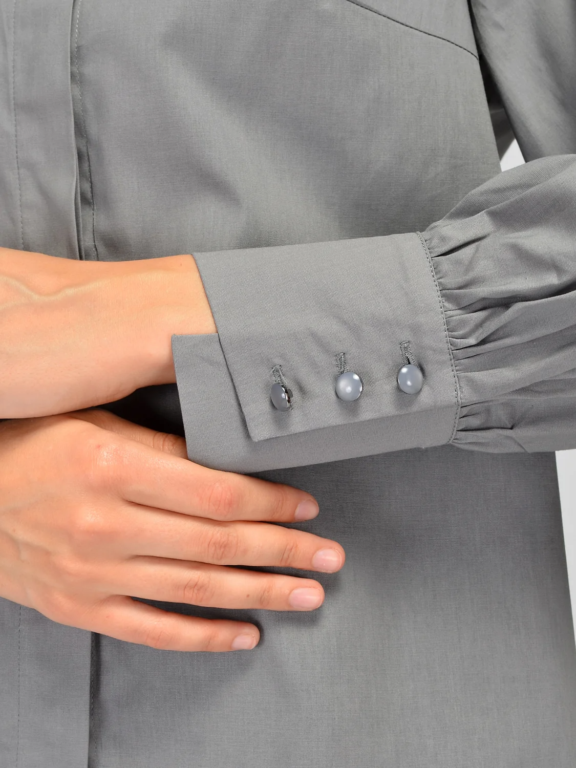Базовая рубашка с оригинальными деталями придется по вкусу модницам любого возраста. Блузка имеет классический отложной воротник, застегивается на пуговицы, которые скрыты вертикальной планкой, чтобы ничто не отвлекало от Вашего образа. Прямой крой с вытачками на груди позволяет вещи идеально сесть на любую фигуру, даже если у Вас большой размер одежды. У блузы модные объемные рукава с интересными манжетами, на которых расположены по три изящных пуговицы. Сам манжет асимметричный, что придает изделию эффектный акцент. Рубашка выполнена из качественной хлопковой ткани, обеспечивая Вам комфорт на протяжении всего дня. Вы можете надеть универсальную блузу на работу, в офис, в школу, а также на торжественные мероприятия, театр или вечеринку. Изделие имеет фигурные вырезы по бокам, полочка и спинка имеют закругленную форму. Вы можете носить вещь как навыпуск, так и заправлять ее за пояс. Вы можете заправить блузу только спереди или со всех сторон. Лаконичная рубашка оверсайз сочетается как со строгими брюками, юбками и жакетами, так и с более повседневными вариантами, например, джинсами. Создайте свои неповторимы образы, взяв за основу базовую блузку оверсайз!