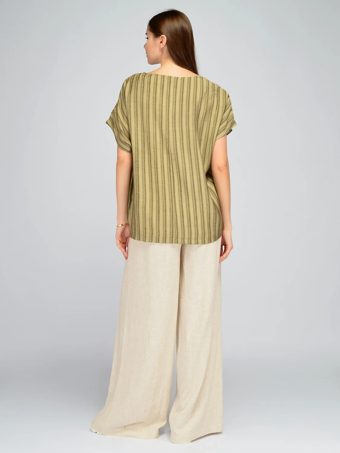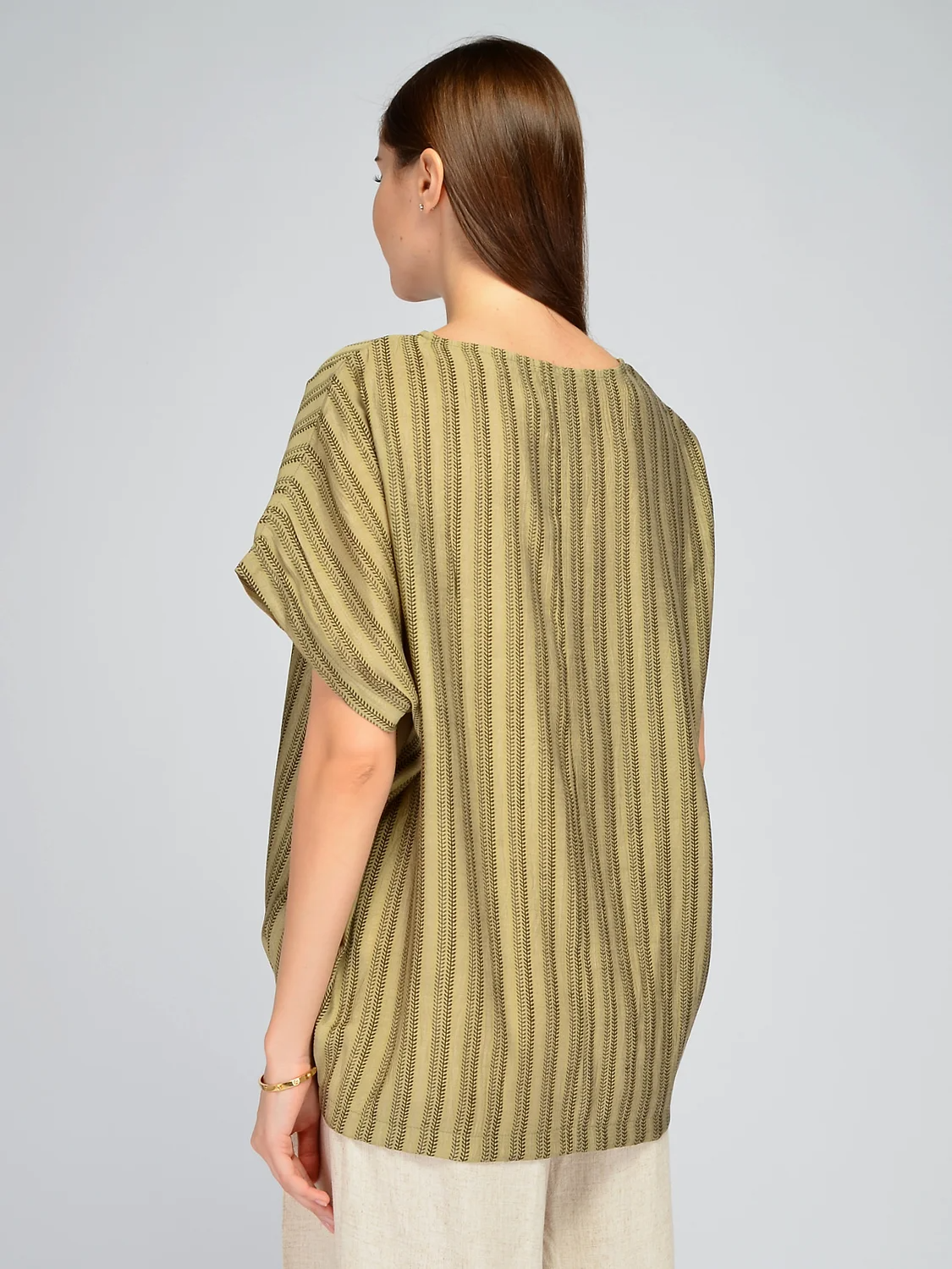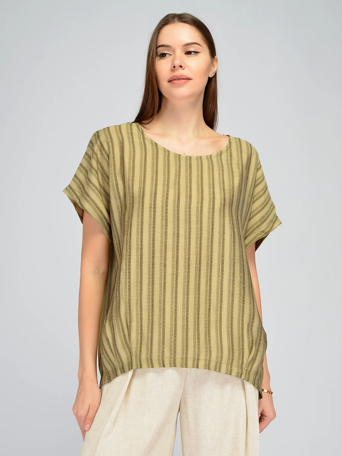 Однотонная блузка оверсайз идеально впишется в летние образы. Округлая горловина и свободные короткие рукава не сковывают движений. Прямой крой не облегает фигуру и поможет скрыть возможные нюансы фигуры в зоне живота и бедер. Удлиненная блузка выполнена из 100% вискозы, которая немного холодит кожу, благодаря чему Вам будет комфортно на протяжении всего дня. Внизу на футболке находятся декоративные складки, добавляющие интереса всему образу. Блузка имеет асимметричный низ, задняя часть немного длиннее передней, что создает модный современный стиль. Универсальная модель может стать частью офисных, праздничных или повседневных образов. Сочетайте легкую блузку с брюками, юбками или кюлотами. Базовая вещь легко сочетается с разными по стилю элементами одежды. Завершите соответствующий образ подходящими украшениями и аксессуарами, которые сыграют акцентную роль. Свободная летняя блузка станет беспроигрышным выбором в знойный сезон.