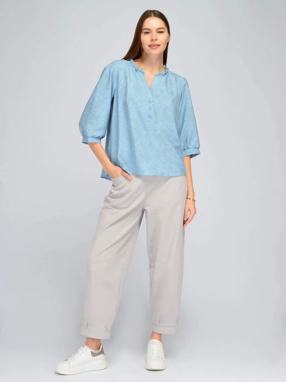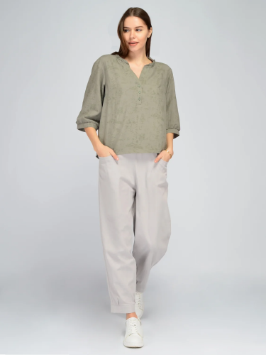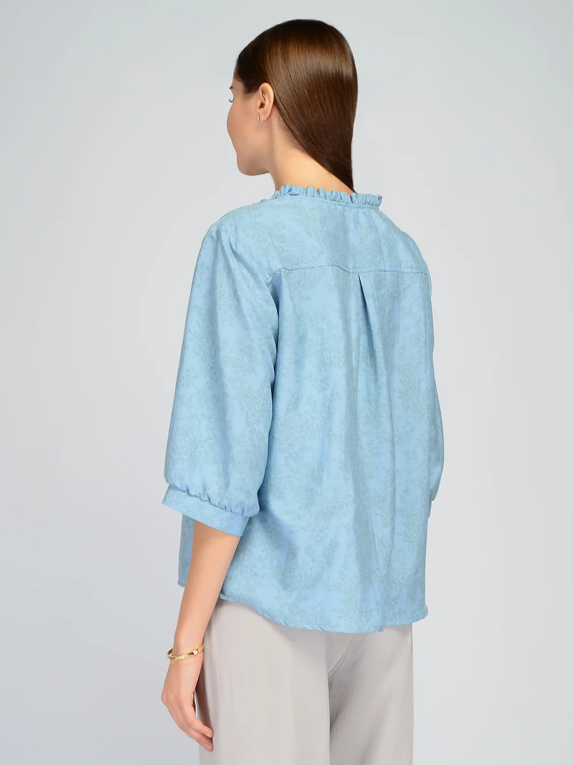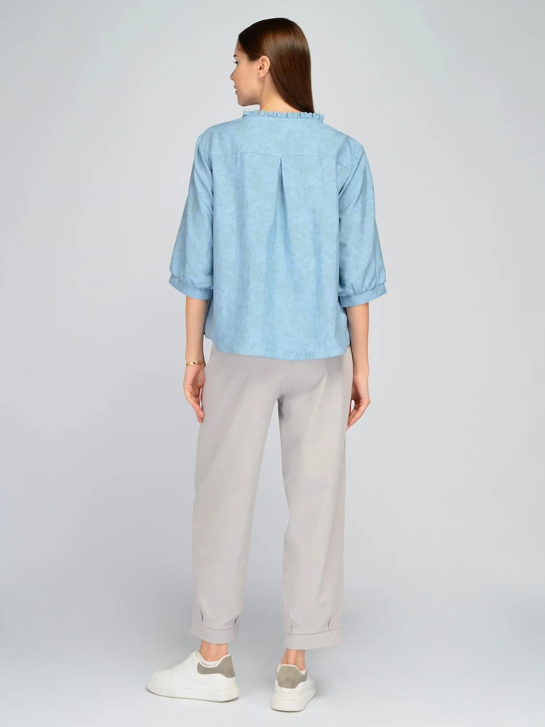 Свободная блузка в интересной расцветке станет важной частью Ваших образов в теплый сезон. Базовая летняя блуза подойдет как взрослым женщинам, так и молодым девушкам, а благодаря широкому прямому крою ее по достоинству оценят будущие мамы. Свободная округлая горловина обыграна декоративными складками, привлекая внимание к Вашему образу. Округлый вырез переходит в V-образный, удлиняя линию шеи и позволяет эффектно дополнить образ подвеской. Застегивается блуза на пуговицы. Модель имеет удобные свободные рукава три четверти с аккуратными манжетами. Удлиненная кофточка имеет вытачки на груди. На спине рубашки находится элегантная декоративная складка. Вы можете носить кофточку навыпуск или заправленной за пояс. Стильная блузка с укороченным рукавом выполнена из легкой струящейся наощупь вискозы. Летняя блузка обеспечит прохладу даже в знойный сезон, и Вы будете чувствовать себя уверенно и комфортно на протяжении всего дня. Блузку с принтом Вы можете носить на работу в офис, на прогулку, на свидание или на торжественное мероприятие. Обувь и аксессуары выбирайте исходя из повода и события. Это могут быть классические и строгие элементы или наоборот повседневные в стиле кэжуал.