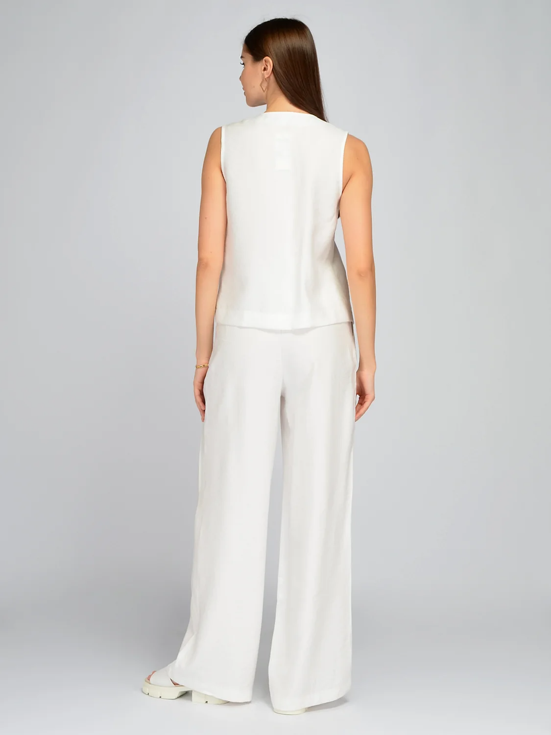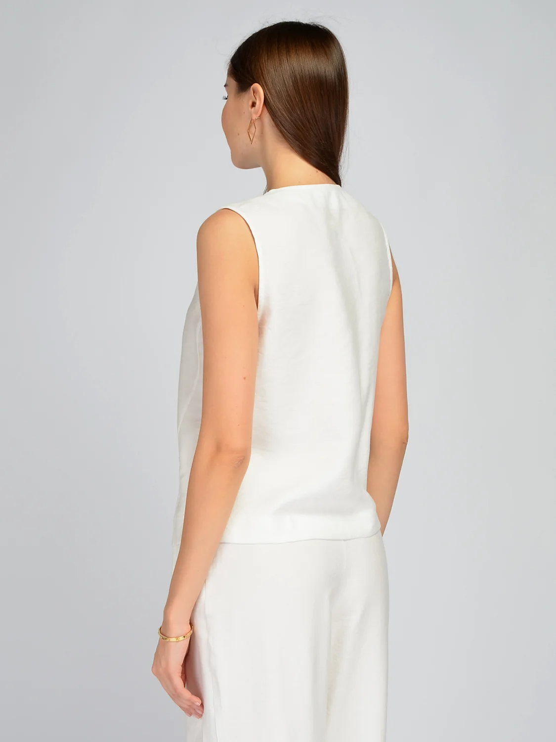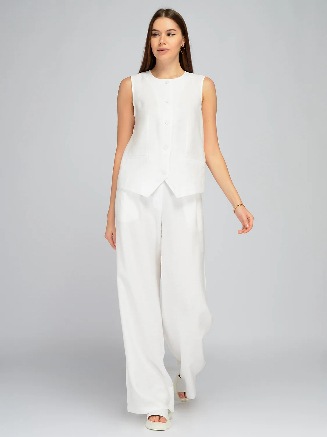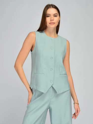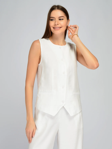 Летняя блузка без рукавов дополнит стильные деловые или праздничные образы. Летний жилет придется по вкусу модницам разного роста и комплекции. Свободный крой жилета скроет возможные нюансы фигуры. Жилет застегивается на пуговицы. Спереди располагаются декоративные вырезы, карманов нет. На модели предусмотрены вертикальные вытачки, поэтому жилет прекрасно сядет на любую фигуру и подчеркнет ее достоинства. Спереди внизу у блузки декоративные треугольный вырез, который придаст элегантности и строгости Вашим образам. Жилетка выполнена из приятной легкой ткани, которая немного холодит кожу, обеспечивая Вам максимальный комфорт даже в самый жаркий день. Под жилет в белом цвете мы рекомендуем выбирать белье телесного оттенка. Сочетайте блузку с брюками палаццо из нашей коллекции, юбками, кюлотами или шортами классического кроя. Вы можете надеть блузку без рукавов на работу в офис, на культурное мероприятие, взять с собой в отпуск на море. В ней Вы будете чувствовать себя уверенно и женственно.
