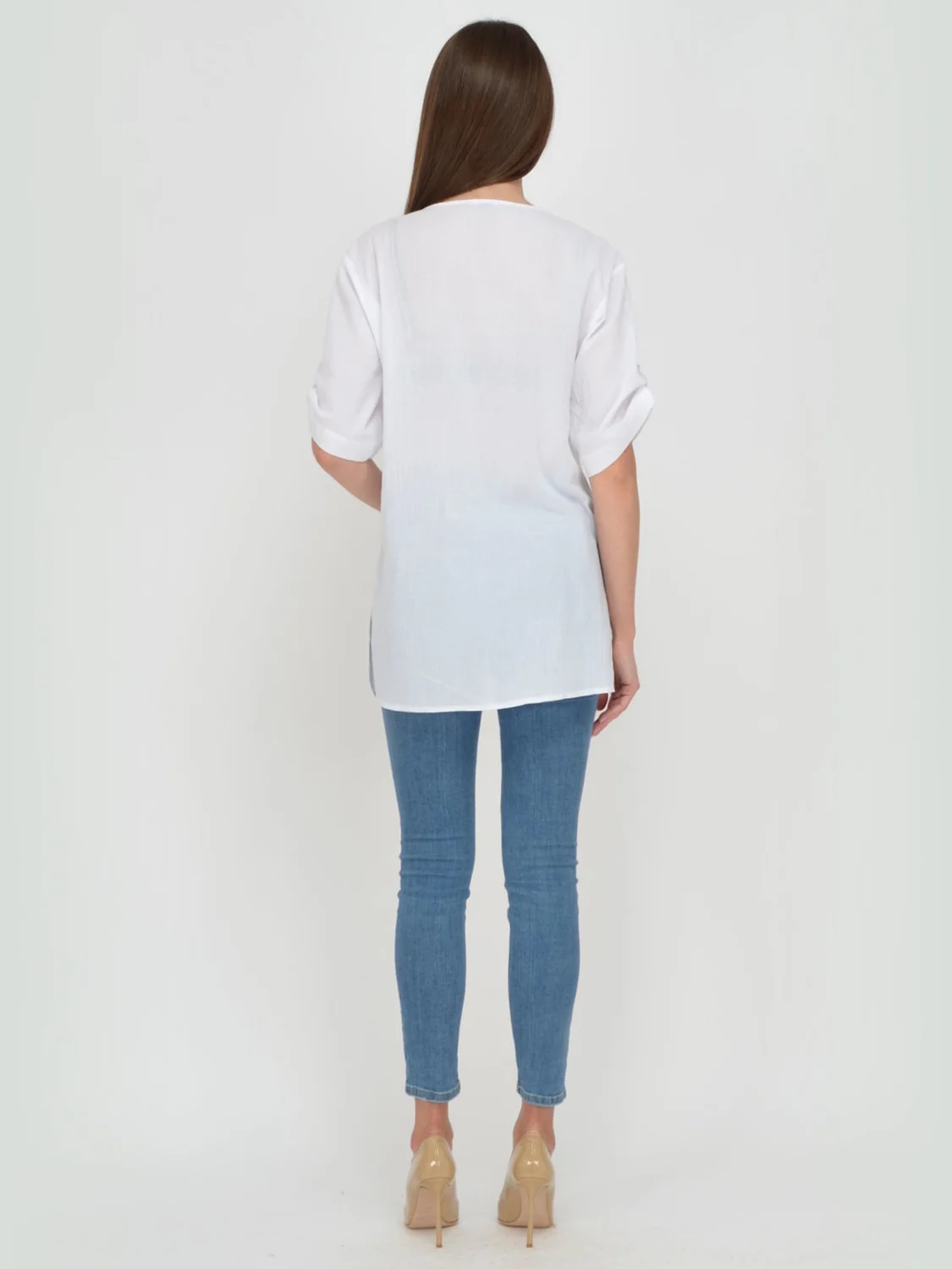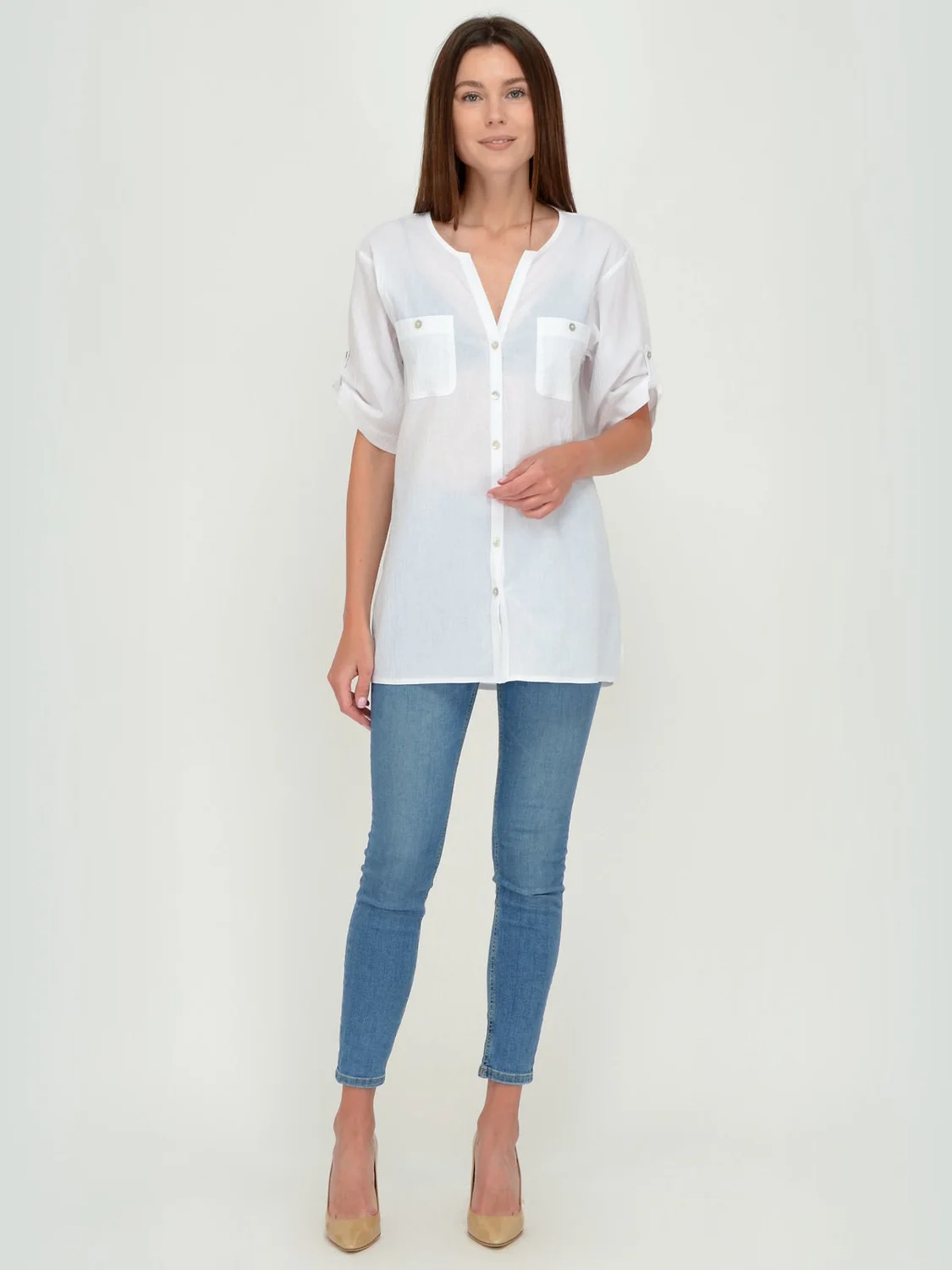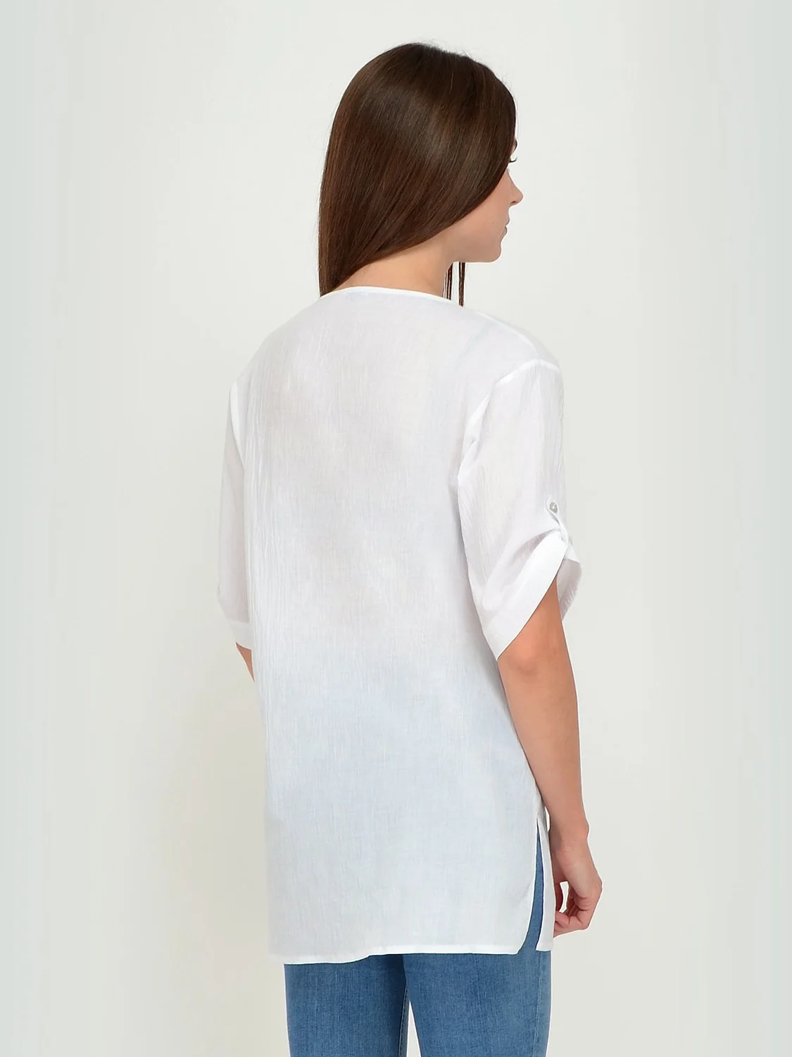 Блузка женская свободного силуэта. Рукав короткий ,можно регулировать длину патом.Карманы накладные на груди. Разрезы по бокам 16 см.