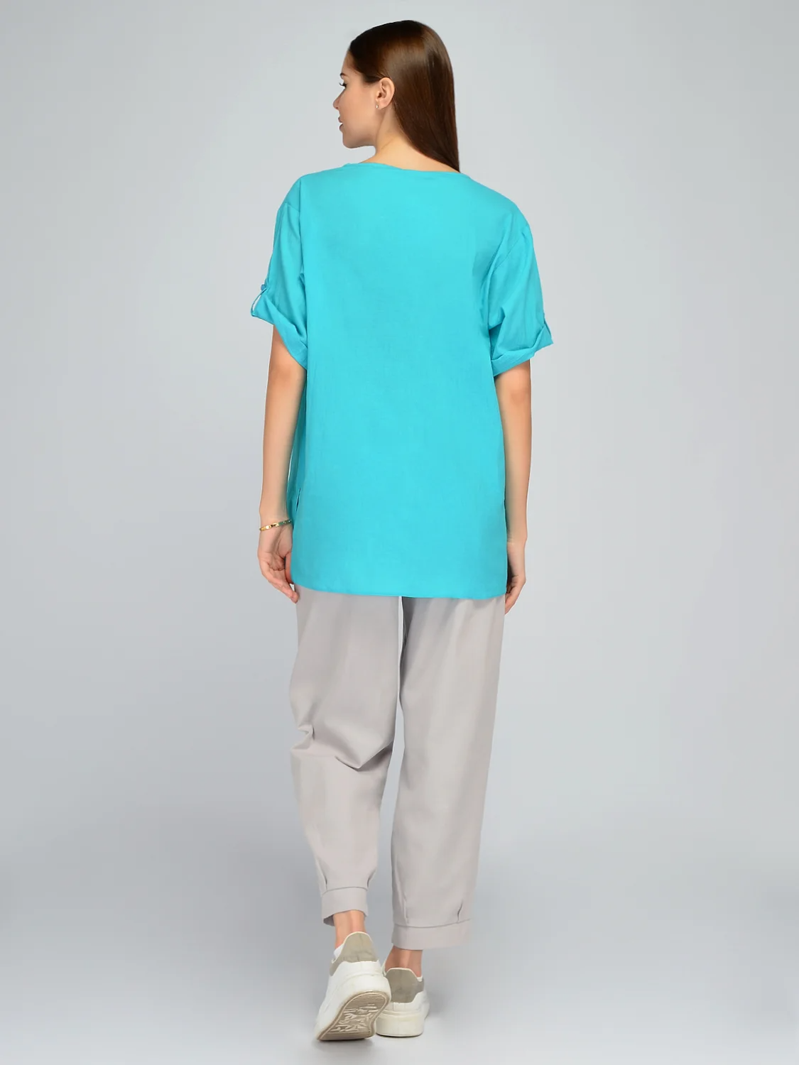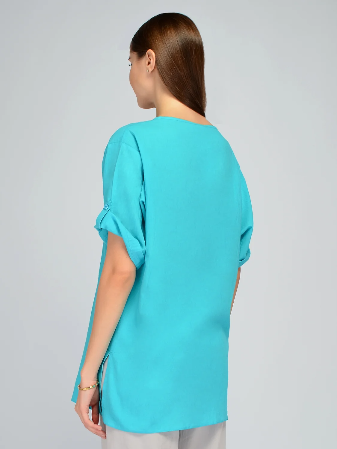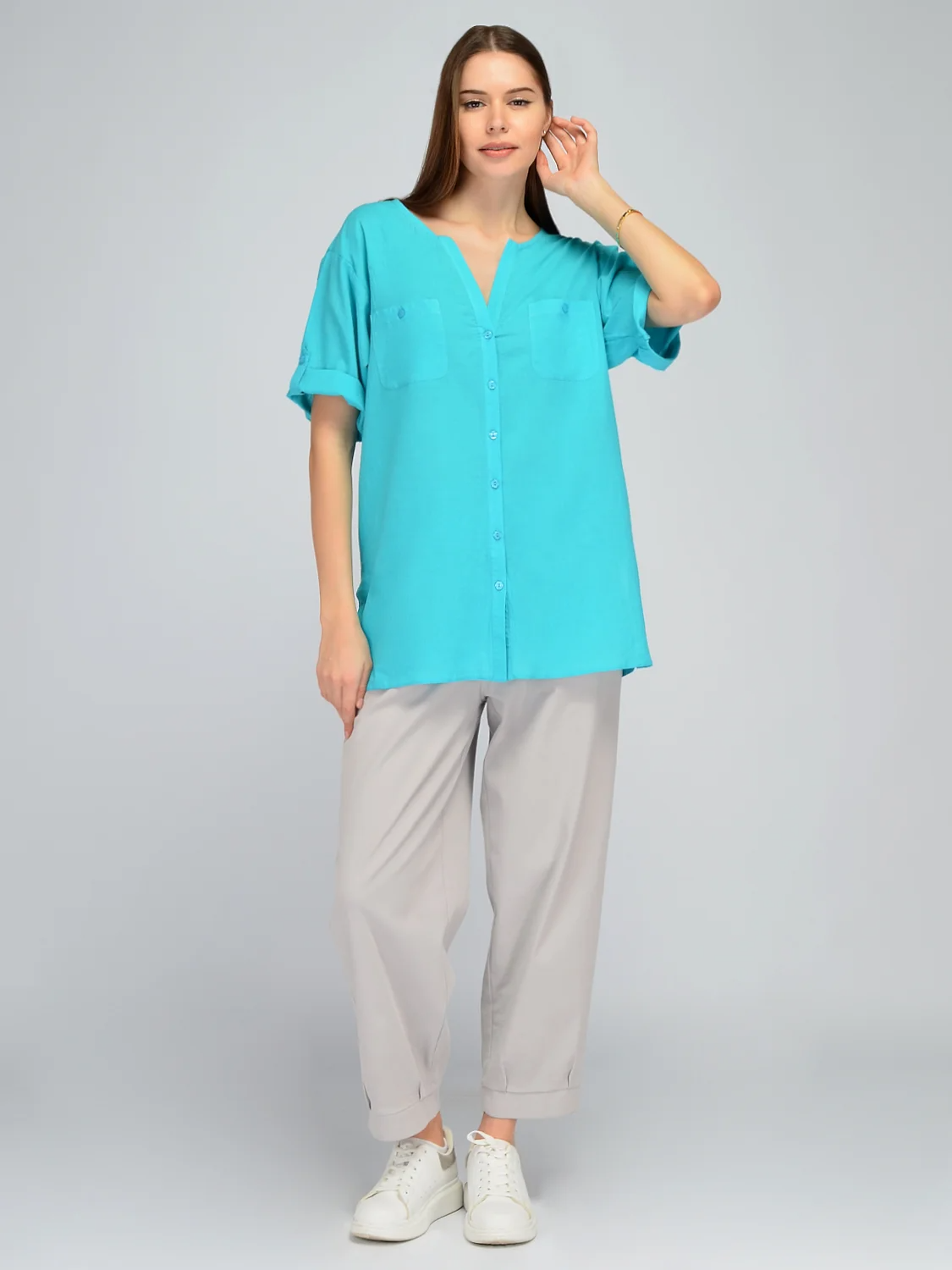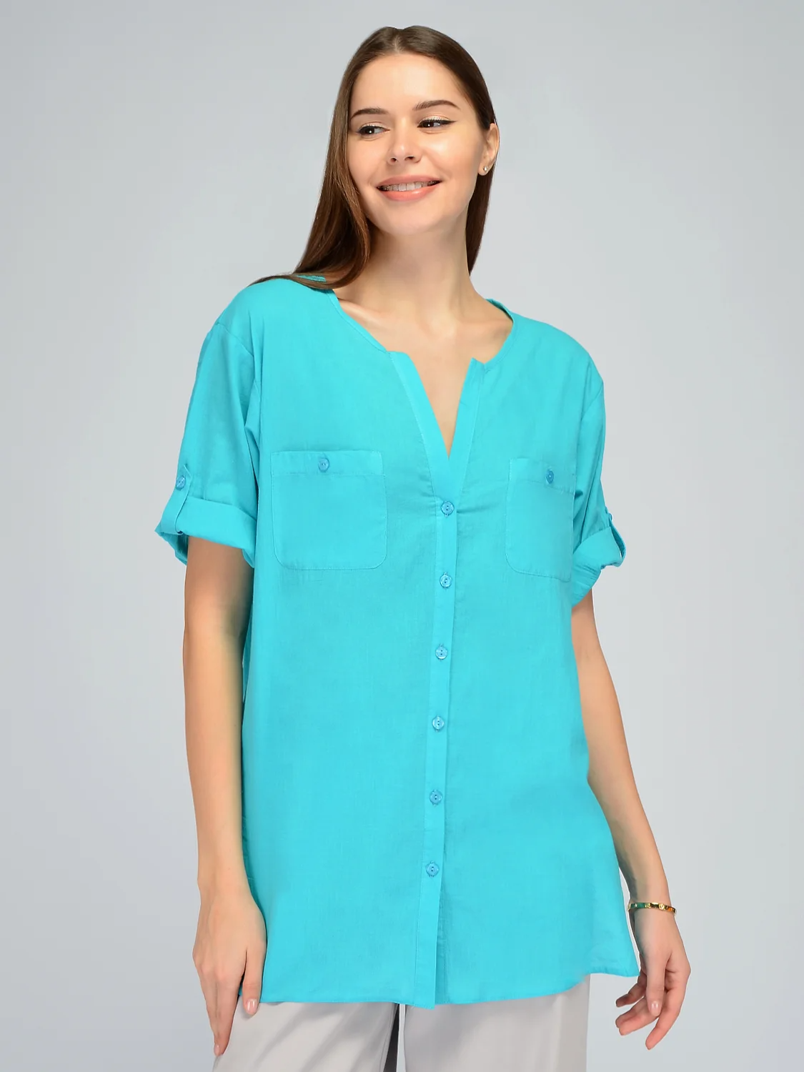 Добавьте в свой весенне-летний гардероб дышащую блузку с укороченными рукавами. Длину коротких рукавов блузки можно удобно регулировать патами. Застегивается рубашка без воротника на пуговицы. Лаконичный фасон блузки дополнен накладными карманами с пуговицами. Округлый вырез переходит в V-образный, выгодно подчеркивая линию шею. Прямой крой блузки позволит Вам чувствовать себя комфортно и уверенно в теплый сезон. Базовая футболка выполнена из 100% хлопка, позволяя Вашей коже дышать. Универсальная блузка подойдет для создания офисного образа для работы или повседневного для прогулок, пикника или бытовых дел. Сочетайте блузку свободного силуэта с юбками, брюками или джинсами. По бокам блузки оверсайз находятся достаточно высокие разрезы, что позволяет удобно заправлять ее за пояс при необходимости. Подбирайте удобную обувь на высоком или на низком ходу. Базовая блуза отшивается в широком размерном ряду, в наличии большие размеры плюс сайз. Создавайте стильные и практичные образы летом!