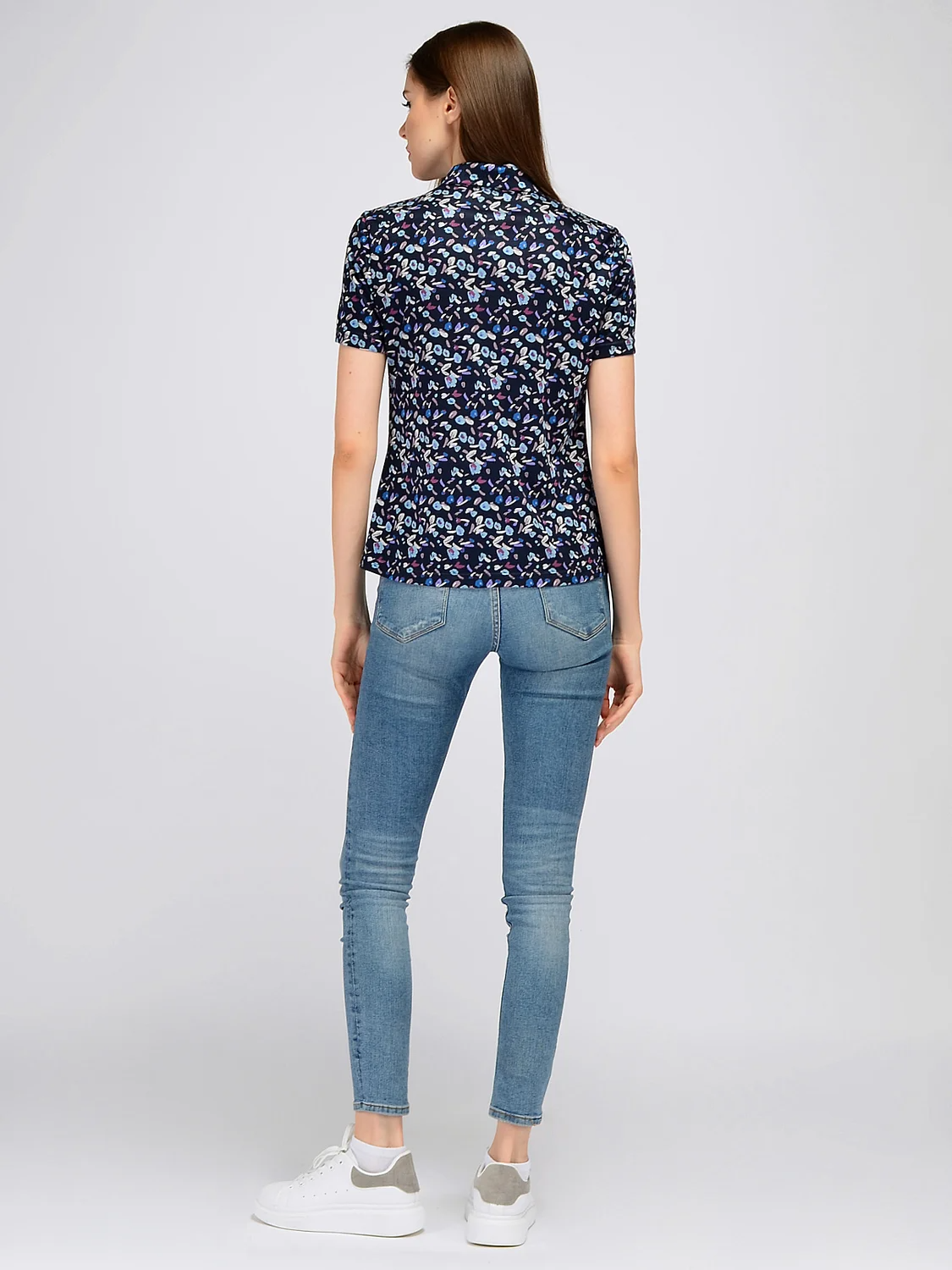 Блузка с отложным воротником.Приталенная блузка с коротким рукавом дополнит офисный или повседневный стиль. Отложной воротник придает образу строгости, а контрастные расцветки добавляют притягательных акцентов. Блузка дополнена декоративными защипами на планке с пуговицами для удобной посадки в груди.Вырез горловины округлый. Отделка горловины воротник. Воротник отложной. Рукава короткие. Рукава втачные. Вид застежки пуговицы. Крой приталенный. Декоративные защипы от планки. Рекомендована стирка при температуре 30С. Создайте свой весенний образ, дополнив блузку с отложным воротником однотонными брюками, юбкой или удобными джинсами. Носите блузку на выпуск или заправленной за пояс. Для делового образа выберите обувь на высоком ходу и жакет. А если собираете городской образ в стиле кэжуал, наденьте удобную обувь на низком ходу и свободный кардиган.