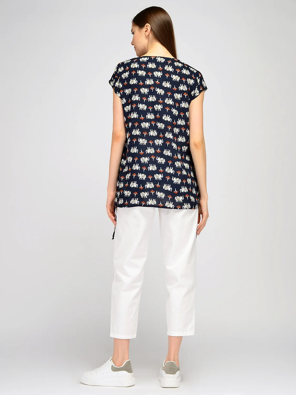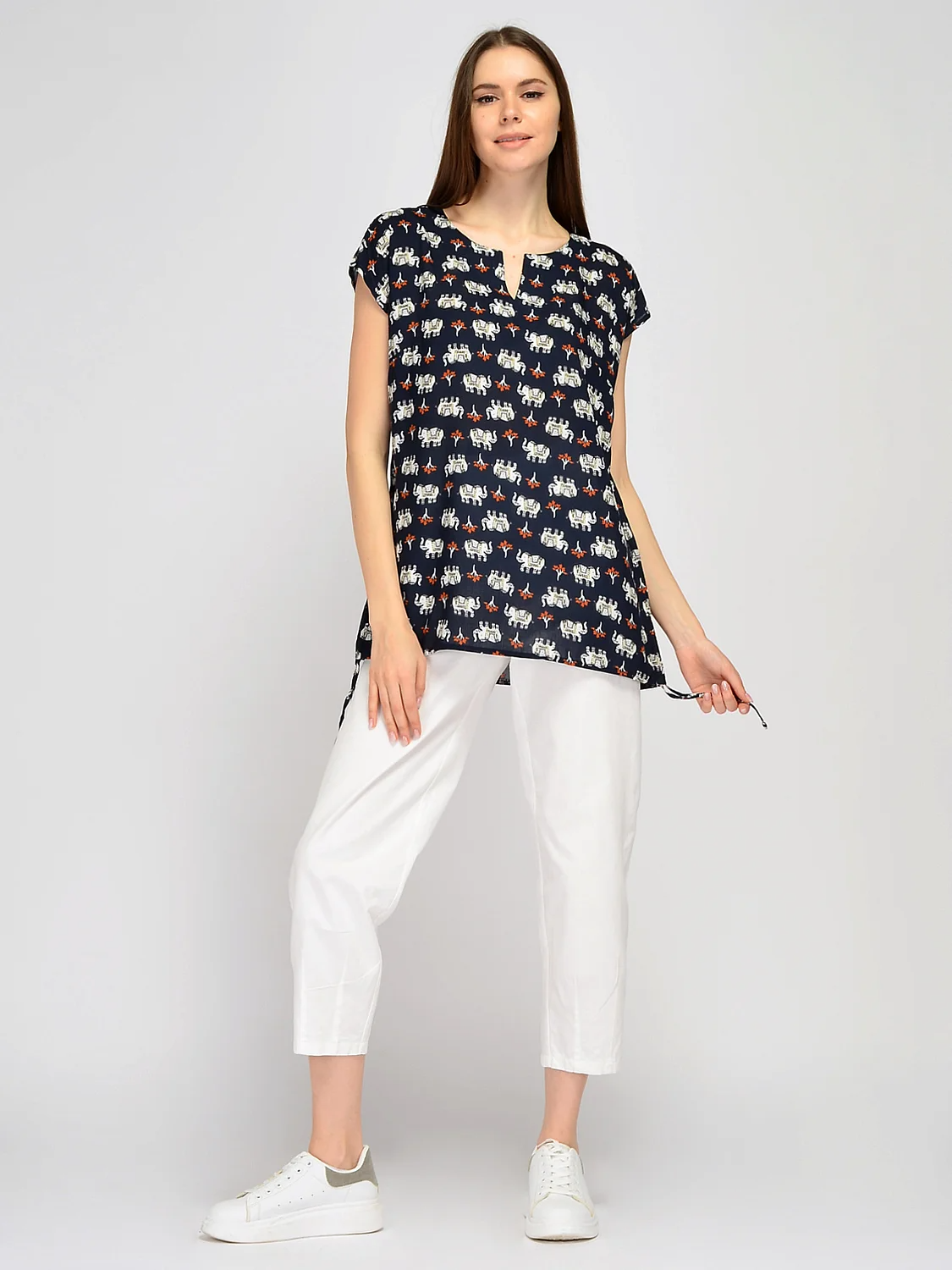 Лаконичный дизайн блузки с коротким рукавом разбавлен яркими принтом. Для завершения подходящего образа подбирайте однотонный низ, любимые украшения и аксессуары. Прямая блузка позволяет не привязываться к определенному стилю. Выбирайте комплекты, подходящие вашему стилю и настроению.