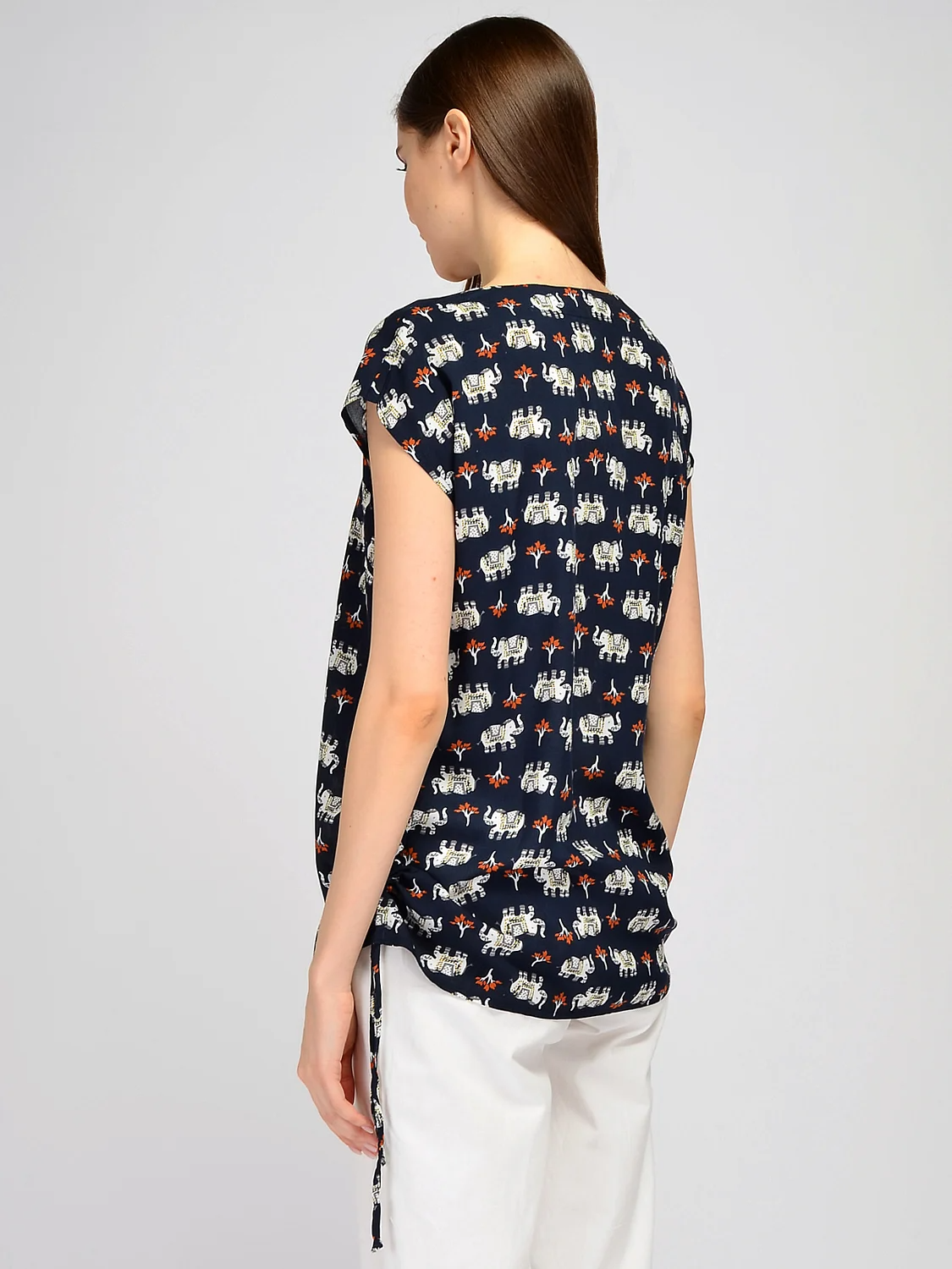 В составе блузки вискоза 100%. Вырез горловины - фигурный. Рукав короткий. Без застёжки. Декоративный элемент - кулиска. Крой прямой. Рукав цельнокроенный. Рекомендована стирка при температуре не более 30С.