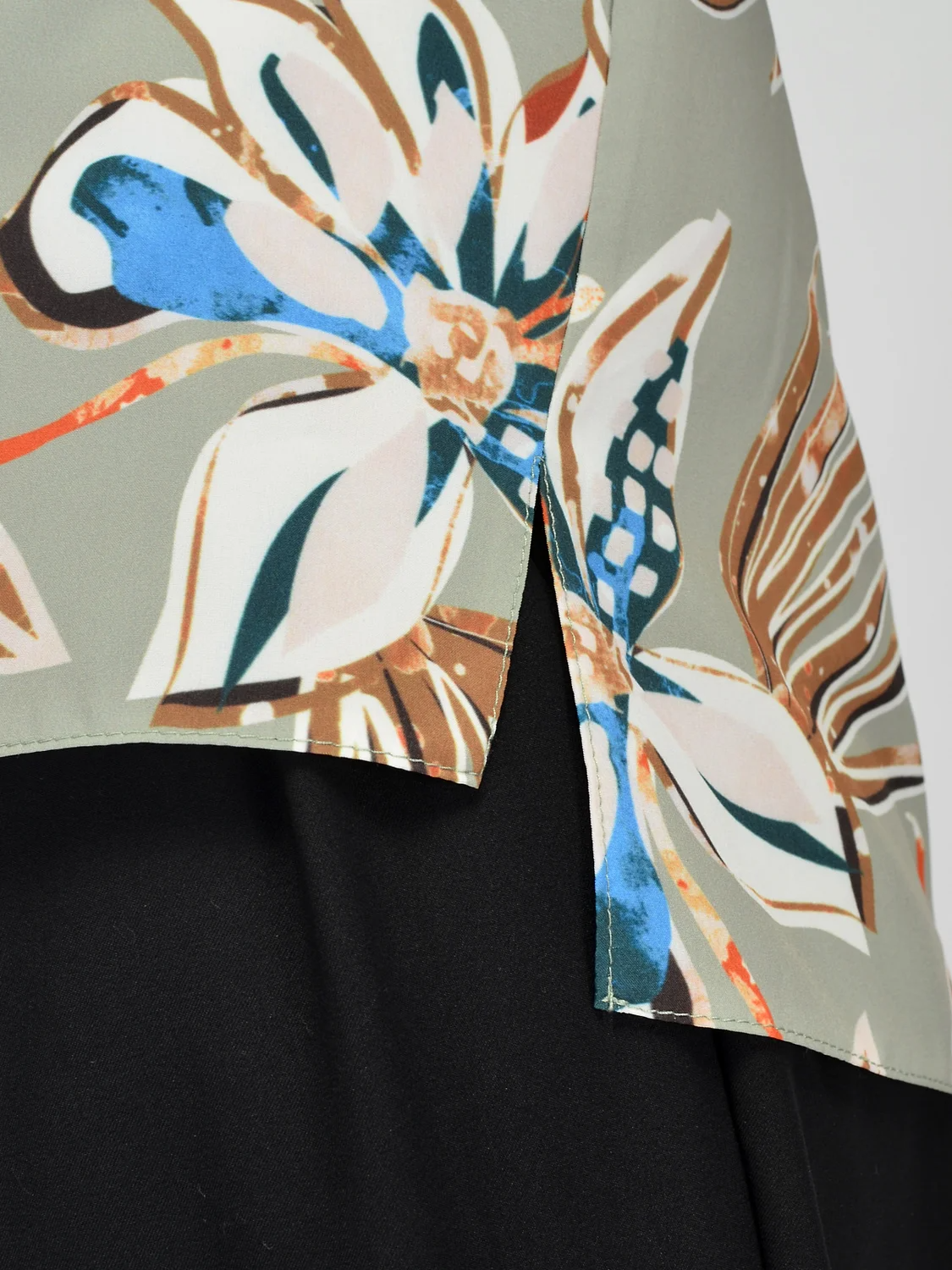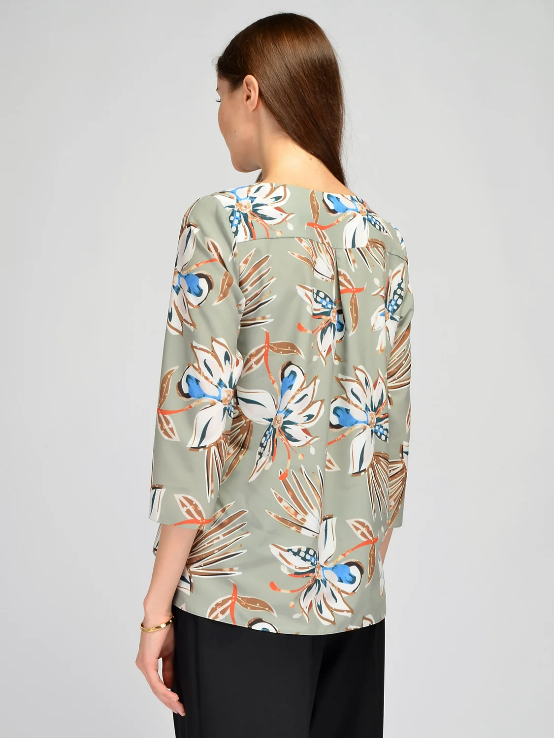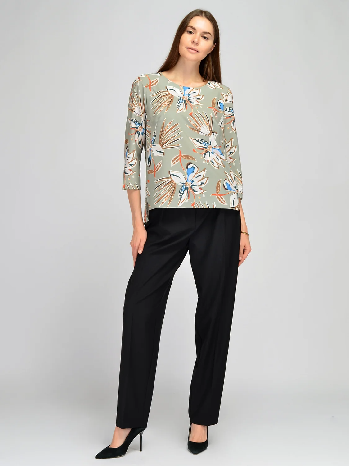 Свободная блузка с рукавами три четверти дополнит гардероб девушек, которые предпочитают классический стиль в одежде. Блузка спринтом имеет аккуратный округлый вырез горловины. По бокам находятся разрезы, а сам низ блузки асимметричен. Спереди изделие немного короче, чем сзади. На спине находится декоративная складка. Модель оверсайз подойдет взрослым женщинам и молодым девушкам с любым типом фигуры. Актуальный прямой крой скроет возможные недостатки фигуры. Вы можете носить тунику как навыпуск, так и заправленной за пояс. Удлиненная сзади модель удачно сочетается как с классическими юбками и брюками, так и с более расслабленными вариантами, например, с джинсами. Блузка станет идеальным дополнением строгих офисных образов для работы, нарядных для торжественных мероприятий, а также комфортных образов в стиле кэжуал для повседневных дел. Базовая блузка впишется как в летний гардероб, так и в весенний, осенний и зимний. В прохладное время года дополните образ удлиненным жакетом или кардиганом.