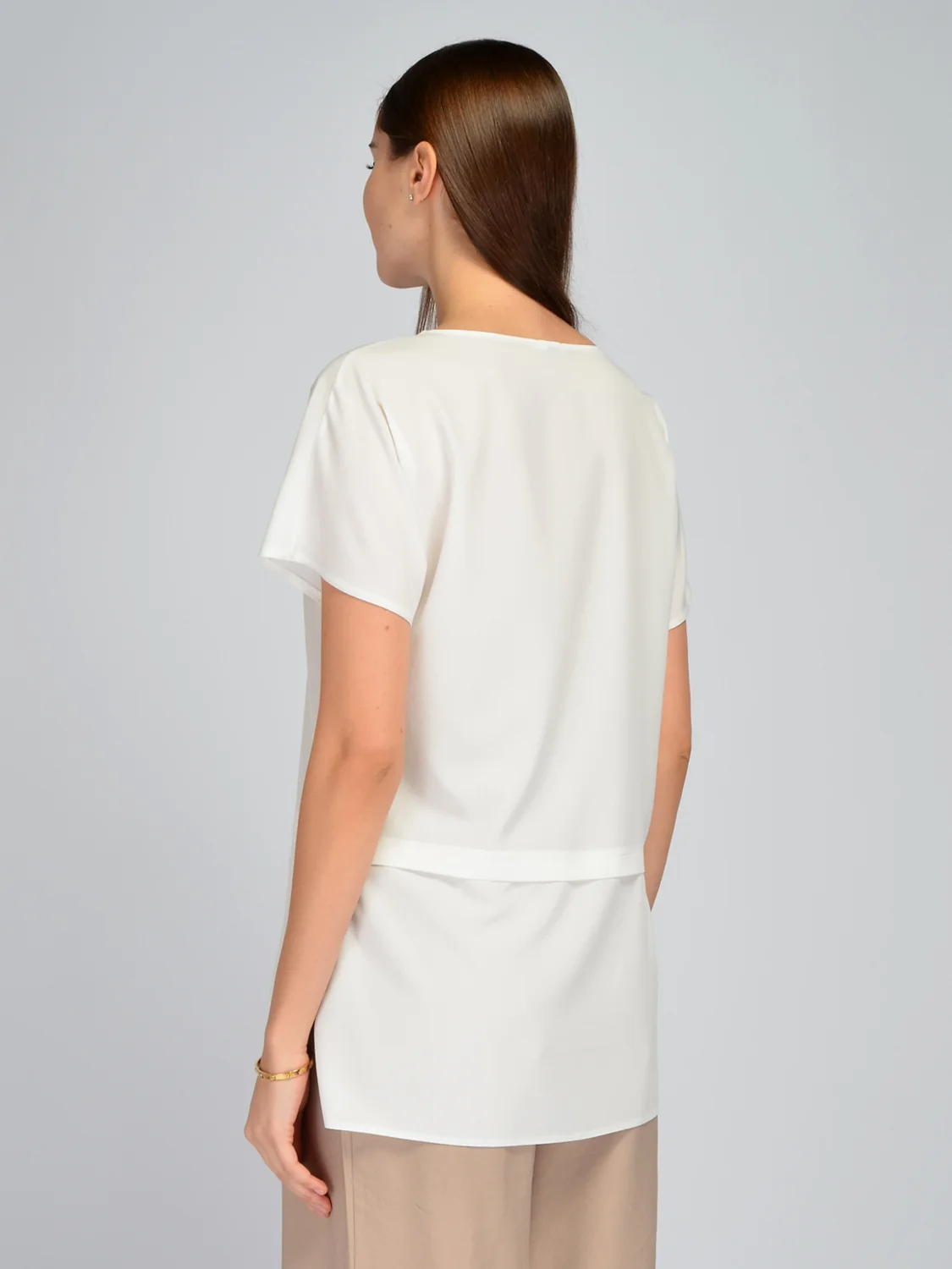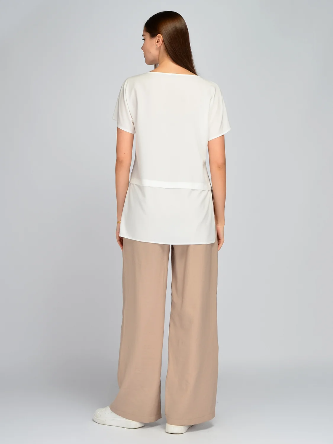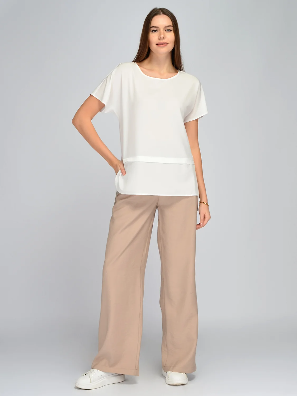 Шелковистая блузка с коротким рукавом станет универсальным элементом Вашего гардероба. Лаконичный свободный крой придаст любому Вашему образу лёгкости и элегантности, а также поможет скрыть возможные нюансы фигуры. Аккуратный округлый вырез горловины не давит на шею и позволяет дополнить образ шейным украшением. Просторные цельнокроеные рукава не сковывают движений и подойдут на разную полноту рук. Отличительной изюминкой блузки является декоративная горизонтальная складка, а также высокие разрезы по бокам. Это позволит легко заправлять блузу за пояс и обеспечит комфорт при носке. Блузка прямого кроя гармонично впишется как в офисный образ, так и в повседневный стиль. Будь то деловое мероприятие или торжественное событие, блузка выгодно подчеркнёт Вашу женственность. Шелковистую однотонную блузку Вы можете сочетать с элементами спортивного стиля, например, с джинсами. А если обыграть ее украшениями, классическим низом и обувью на каблуке, Вы получите нарядный образ на выход.