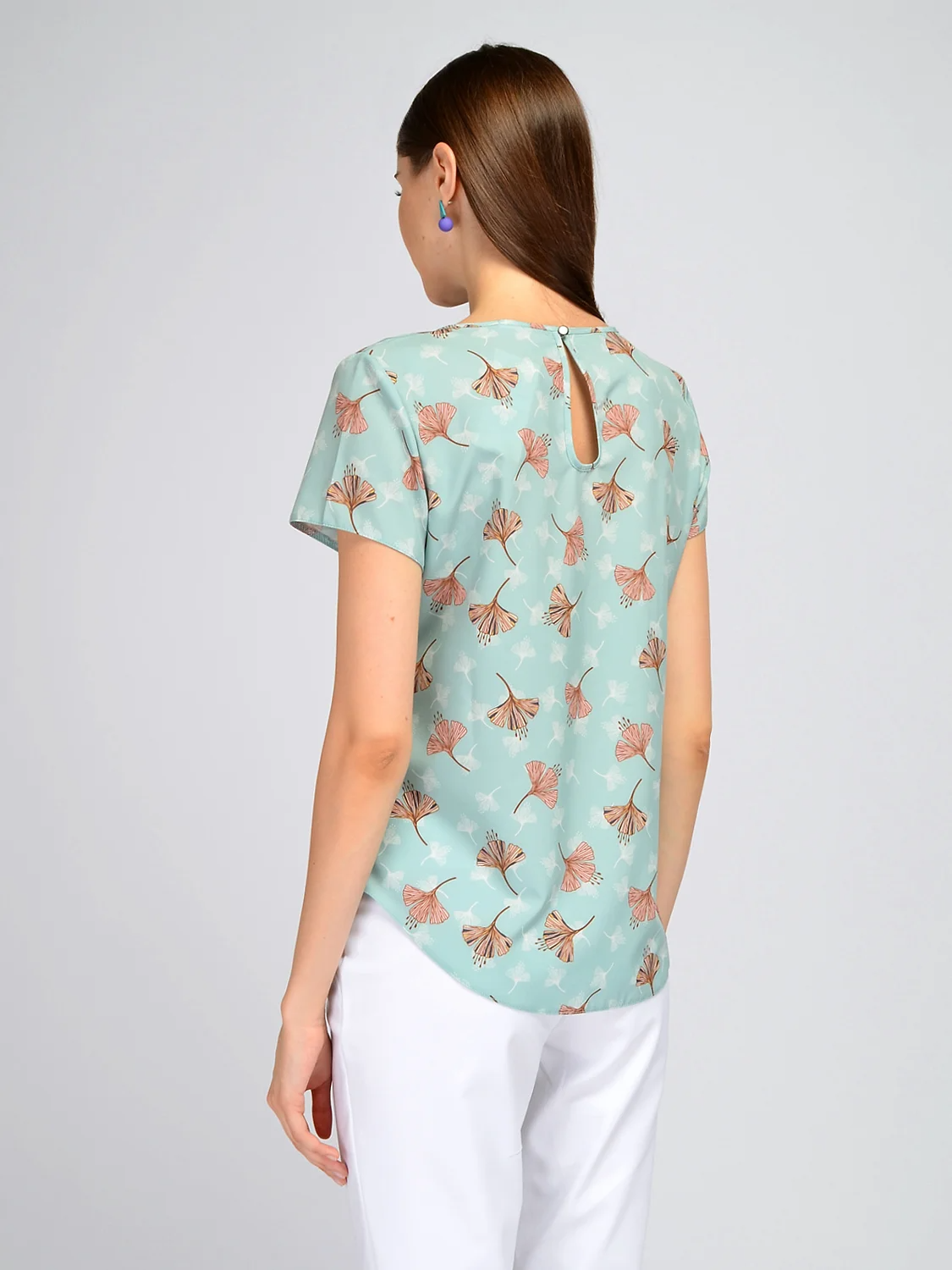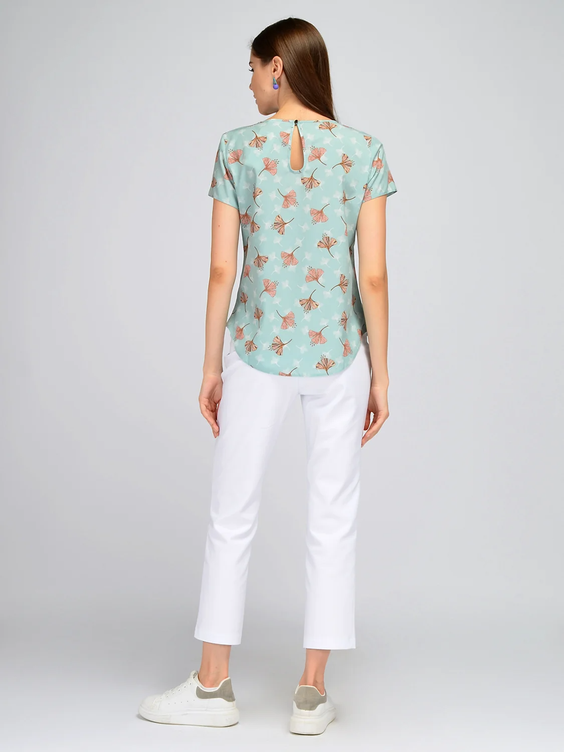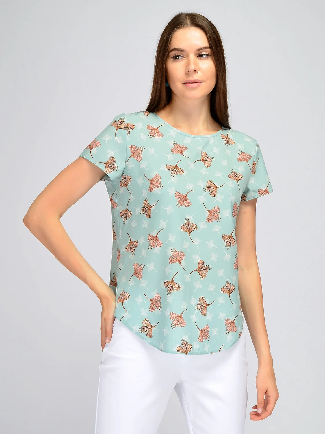 Блузка с коротким рукавом.Блузка с коротким рукавом - беспроигрышный компонент Вашего весеннего образа. Округлая горловина, вырез на спинке с пуговицей и принт придадут Вашему образу женственности и изящности. Блузку с фигурным низом захочется надеть в офис, на прогулку, на свидание. Лаконичный силуэт и цветовые сочетания делают блузку универсальной моделью.