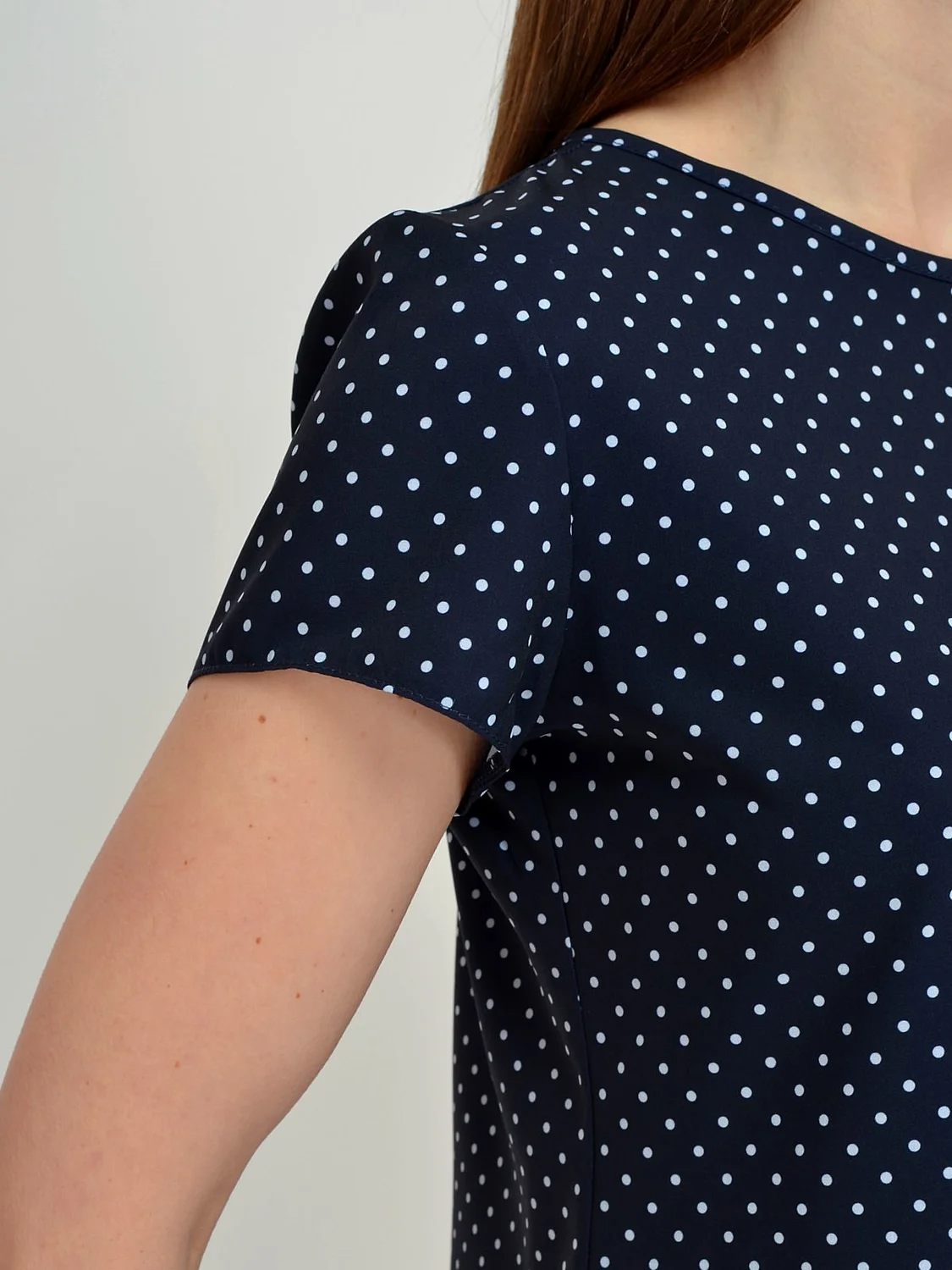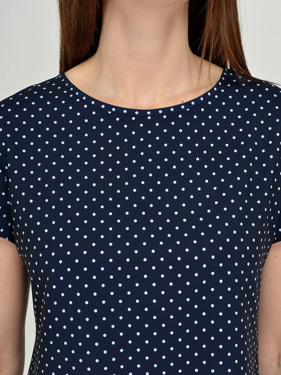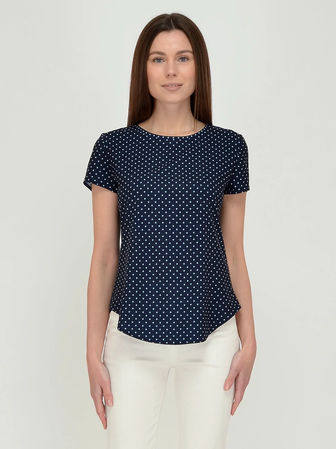 Блузка женская приталенного силуэта с коротким рукавом. Сзади вырез - "капля", застегивается на пуговицу.