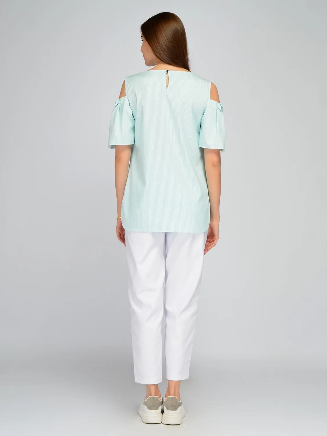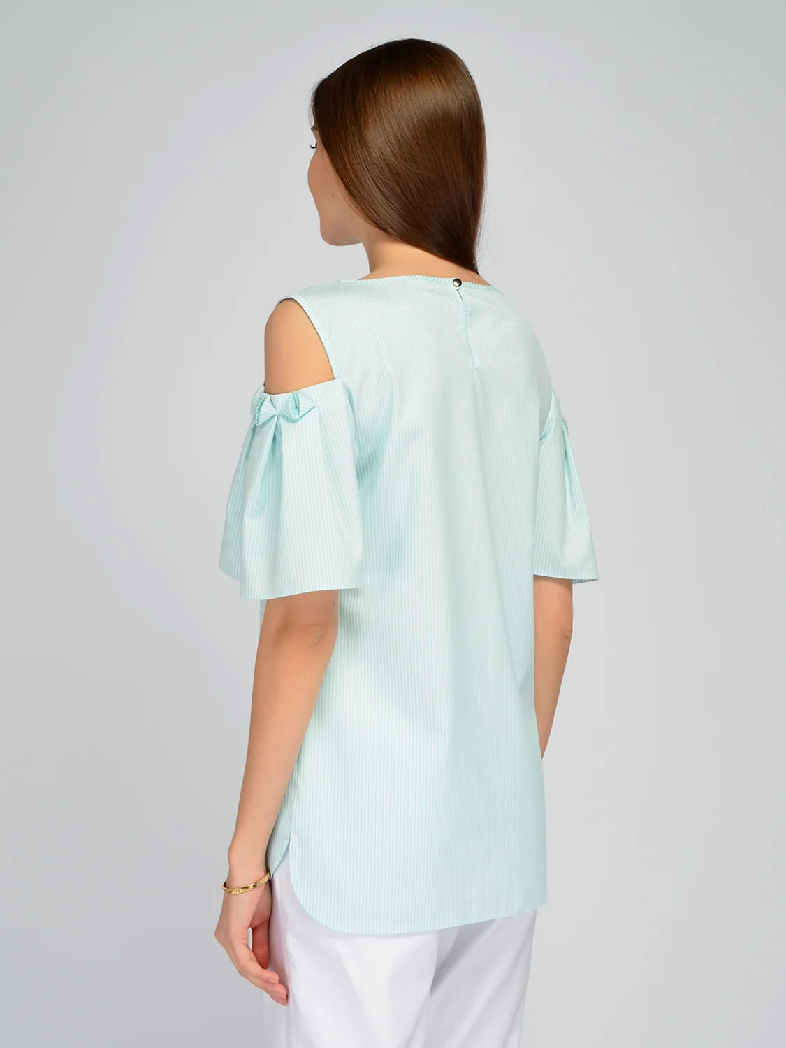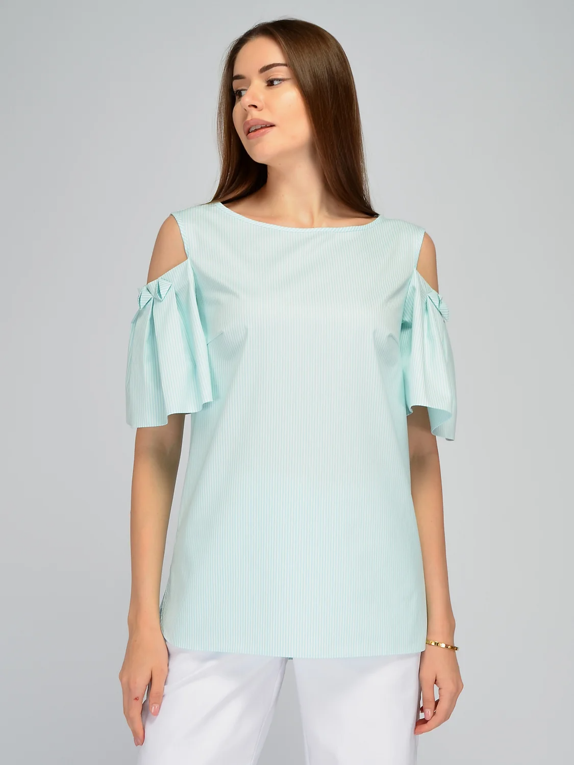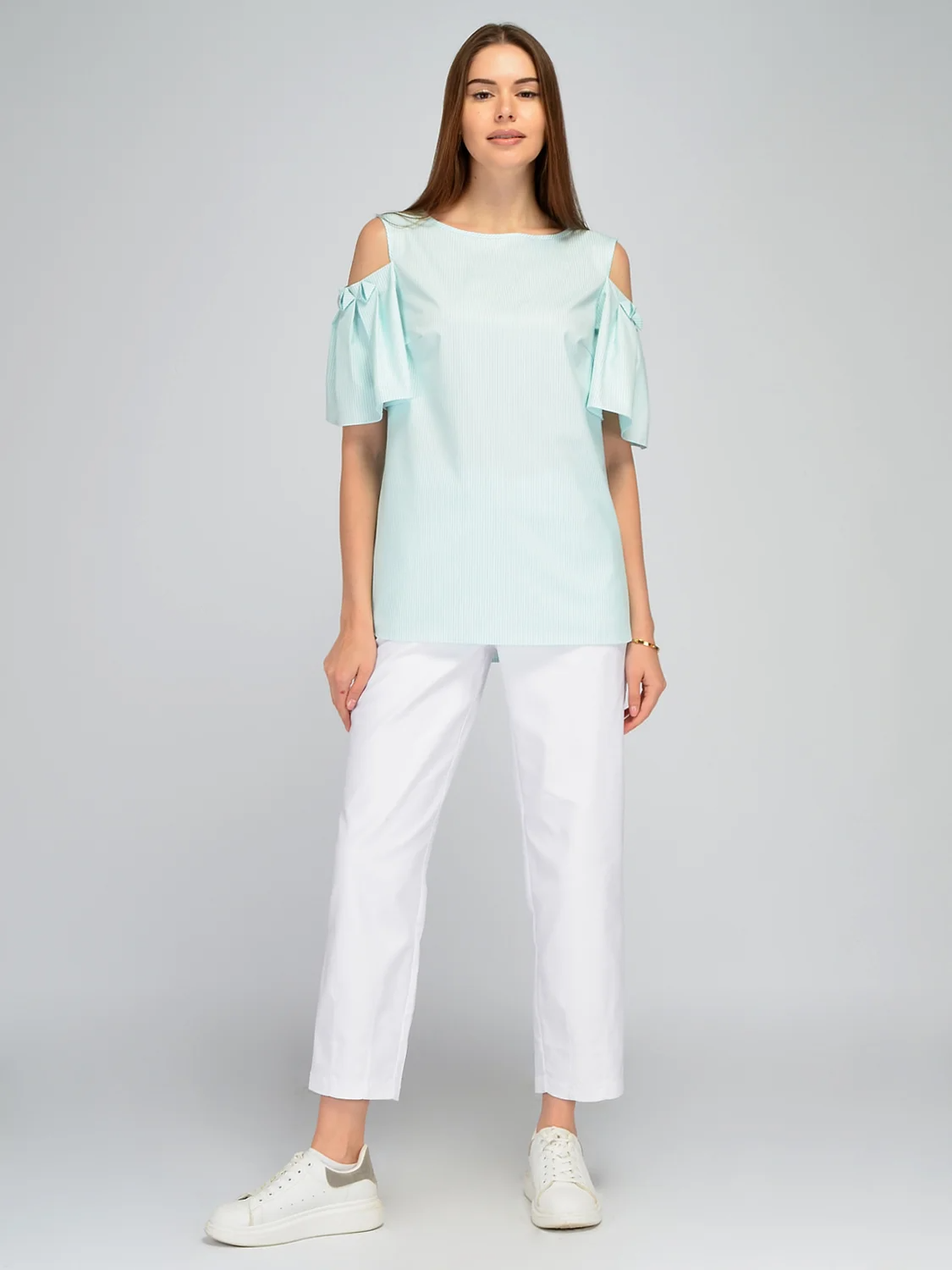 Летняя блузка с открытыми плечами станет эффектной новинкой в Вашем гардеробе. Круглый вырез горловины лодочка изящно приоткрывает ключицу. Прямой крой не облегает фигуру и скрывает ее возможные недостатки. На блузе предусмотрены вытачки, поэтому она прекрасно сядет на любые формы. Главной отличительной чертой изделия являются объемные спущенные рукава со складками. Лаконичный крой блузки в сочетании со свободными рукавами, которые приоткрывают плечи, делают эту модель универсальной вещью для, работы, праздничных мероприятий, для отпуска. Блузка имеет асимметричный фигурный низ, что позволит красиво заправить ее за пояс, или Вы можете носить блузу навыпуск. Базовая летняя блузка впишется как в городские повседневные образы, так и в более классические. Вы будете выглядеть женственно и романтично в блузке с открытыми плечами. Блуза выполнена из натуральной хлопковой ткани, а это значит, что Вы будете чувствовать себя комфортно на протяжении всего летнего дня.