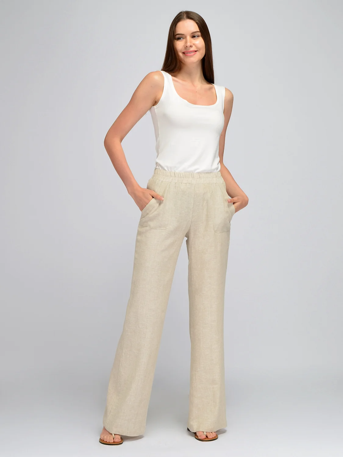 Летние льняные брюки подарят комфорт и удобство в знойный сезон. Длинные свободные брюки идеально сядут по фигуре за счет удобной широкой резинки в поясе. Брюки палаццо дополнены практичными боковыми накладными карманами. Вы можете надеть льняные брюки на работу, на прогулку или праздник. Благодаря качественному натуральному материалу Вам не будет жарко в течение всего дня. Легкие брюки отлично впишутся в образы для отпуска, отдыха на море, для пляжа. Свободный крой скроет возможные недостатки фигуры и придаст легкости Вашей походке. Брюки изо льна и вискозы прекрасно сочетаются с топами, футболками, блузками. В качестве обуви можете выбирать босоножки, кеды или сандалии. Повседневные брюки трубы придутся по вкусу как взрослым женщинам, так и молодым девушкам и даже подросткам. Широкий размерный ряд позволит Вам чувствовать себя свободно в выборе размера. Стильные брюки в пол станут Вашим любимым дополнением летних образов! Трендовые брюки палаццо прекрасно подойдут для офиса, свидания или в качестве дополнения повседневных образов в стиле кэжуал.
