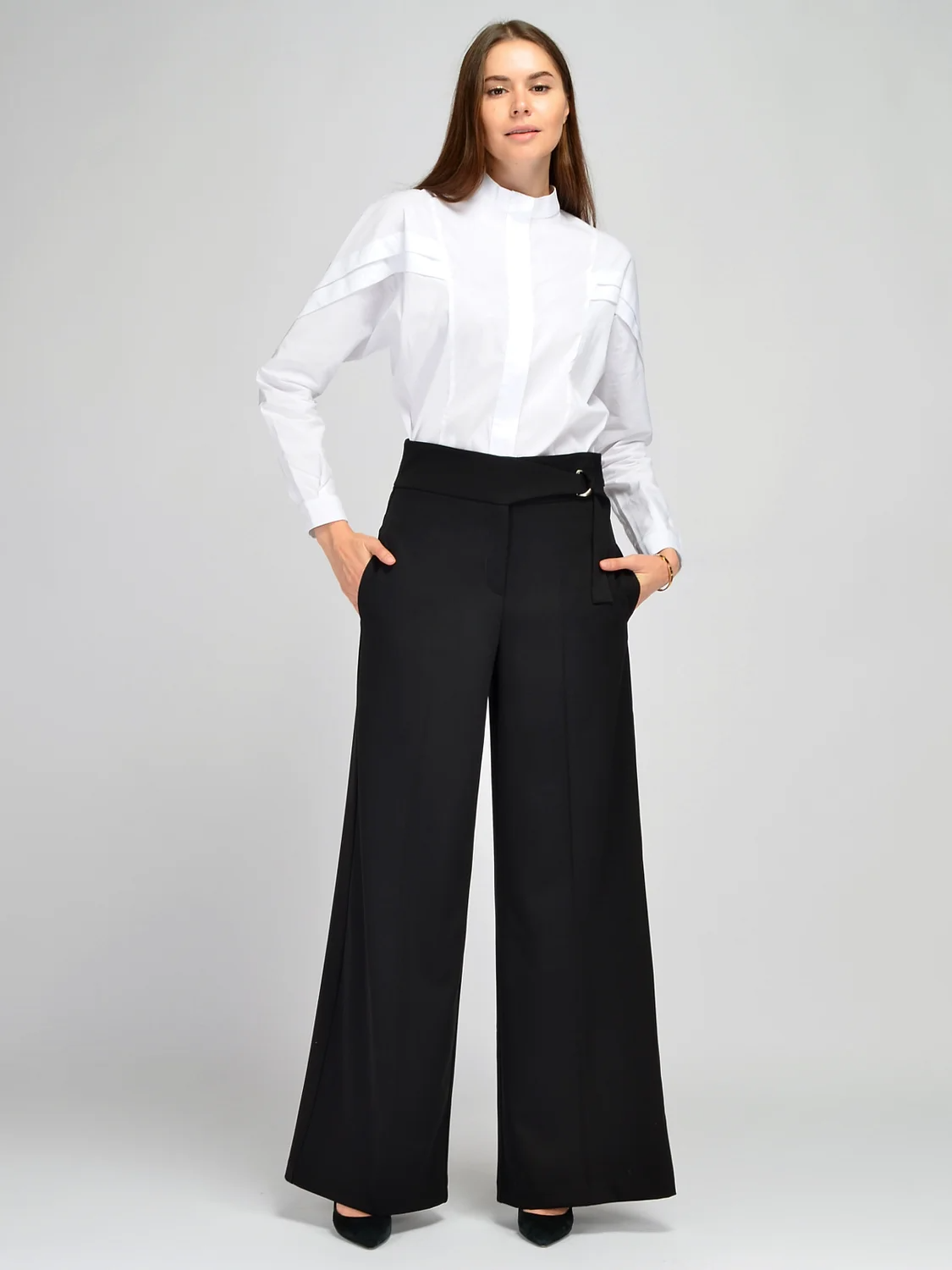 Стильные брюки полной длины станут актуальным элементом гардероба на межсезонье или зимой. Классический крой со стрелками не облегает ноги, красиво струится при ходьбе. Строгие брюки палаццо имеют интересный пояс, притягивающий внимание. Кокетка брюк переходит в аккуратный пояс, который затягивается для наилучшей посадки на талии. Высокие штаны дополнены боковыми карманами в шве, что особенно актуально в современном темпе жизни. Модель выполнена из качественной плотной ткани, которая практически не мнется, что обеспечит Вам опрятный образ на протяжении всего дня. Деловые брюки придутся по вкусу тем, кто выбирает классический стиль в одежде или чья работа подразумевает строгий дресс-код. При этом длинные брюки подойдут и для праздничных мероприятий. Обувь желательно подбирать на каблуке, чтобы подчеркнуть длину Ваших ног и сохранить женственный стиль. В качестве плечевого изделия можно выбрать рубашку, блузку, топ, жакет или футболку. Дополните свой образ подходящими украшениями и аксессуарами.