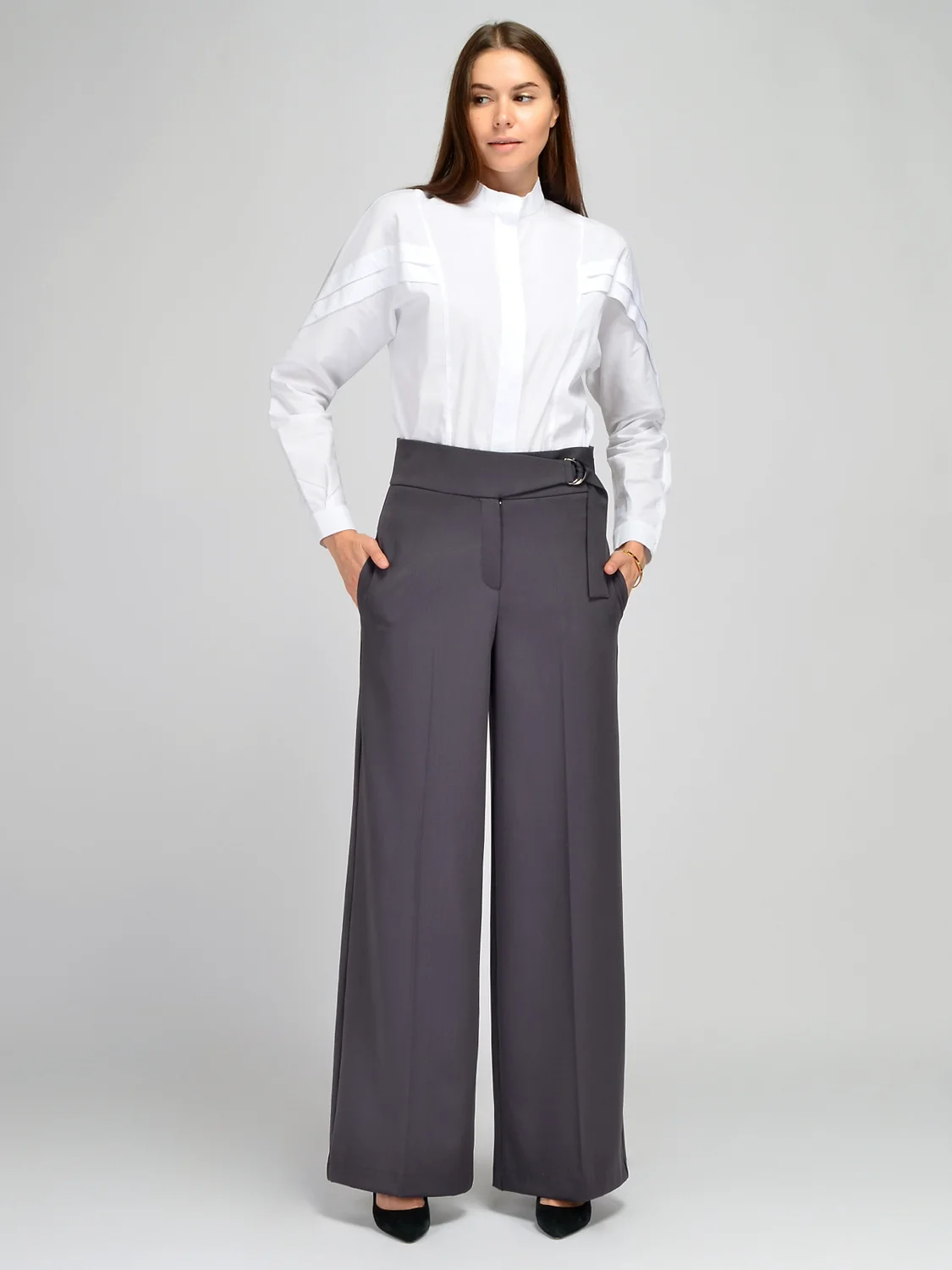 Стильные брюки полной длины станут актуальным элементом гардероба на межсезонье или зимой. Классический крой со стрелками не облегает ноги, красиво струится при ходьбе. Строгие брюки палаццо имеют интересный пояс, притягивающий внимание. Кокетка брюк переходит в аккуратный пояс, который затягивается для наилучшей посадки на талии. Высокие штаны дополнены боковыми карманами в шве, что особенно актуально в современном темпе жизни. Модель выполнена из качественной плотной ткани, которая практически не мнется, что обеспечит Вам опрятный образ на протяжении всего дня. Деловые брюки придутся по вкусу тем, кто выбирает классический стиль в одежде или чья работа подразумевает строгий дресс-код. При этом длинные брюки подойдут и для праздничных мероприятий. Обувь желательно подбирать на каблуке, чтобы подчеркнуть длину Ваших ног и сохранить женственный стиль. В качестве плечевого изделия можно выбрать рубашку, блузку, топ, жакет или футболку. Дополните свой образ подходящими украшениями и аксессуарами.