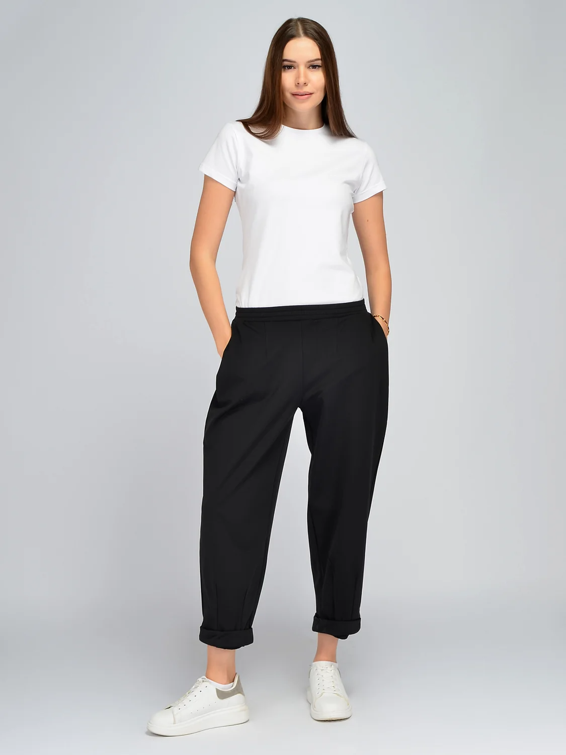 Свободные брюки бананы помогут дополнить повседневные образы круглый год. Удобный пояс на резинке позволит модели прекрасно сидеть на любой фигуре. Штаны имеют практичные боковые карманы, которые скрыты интересной декоративной складкой. Сзади на модели предусмотрена кокетка, что придает брюкам спортивный вид. Широкие брюки заужаются к низу. Фасон мом сохраняет свою актуальность и в предстоящем сезоне. Пришитый подворот на манжете придает образу непринужденности и легкости. Базовые трикотажные брюки выполнены из мягкой ткани, в которой Вам будет комфортно на протяжении всего дня. Еще одним немаловажным плюсом ткани является отсутствие склонности к образованию складок и заломов, а значит, в процессе носки и после стирки брюки практически не мнутся и не требуют глажки. Современный фасон укороченных брюк придется по вкусу девушкам и женщинам разного возраста и комплекции. Сочетайте бананы с повседневным верхом и удобной обувью. Вы можете отправиться на прогулку, пикник или по делам и всегда будете чувствовать себя уверенно и комфортно.