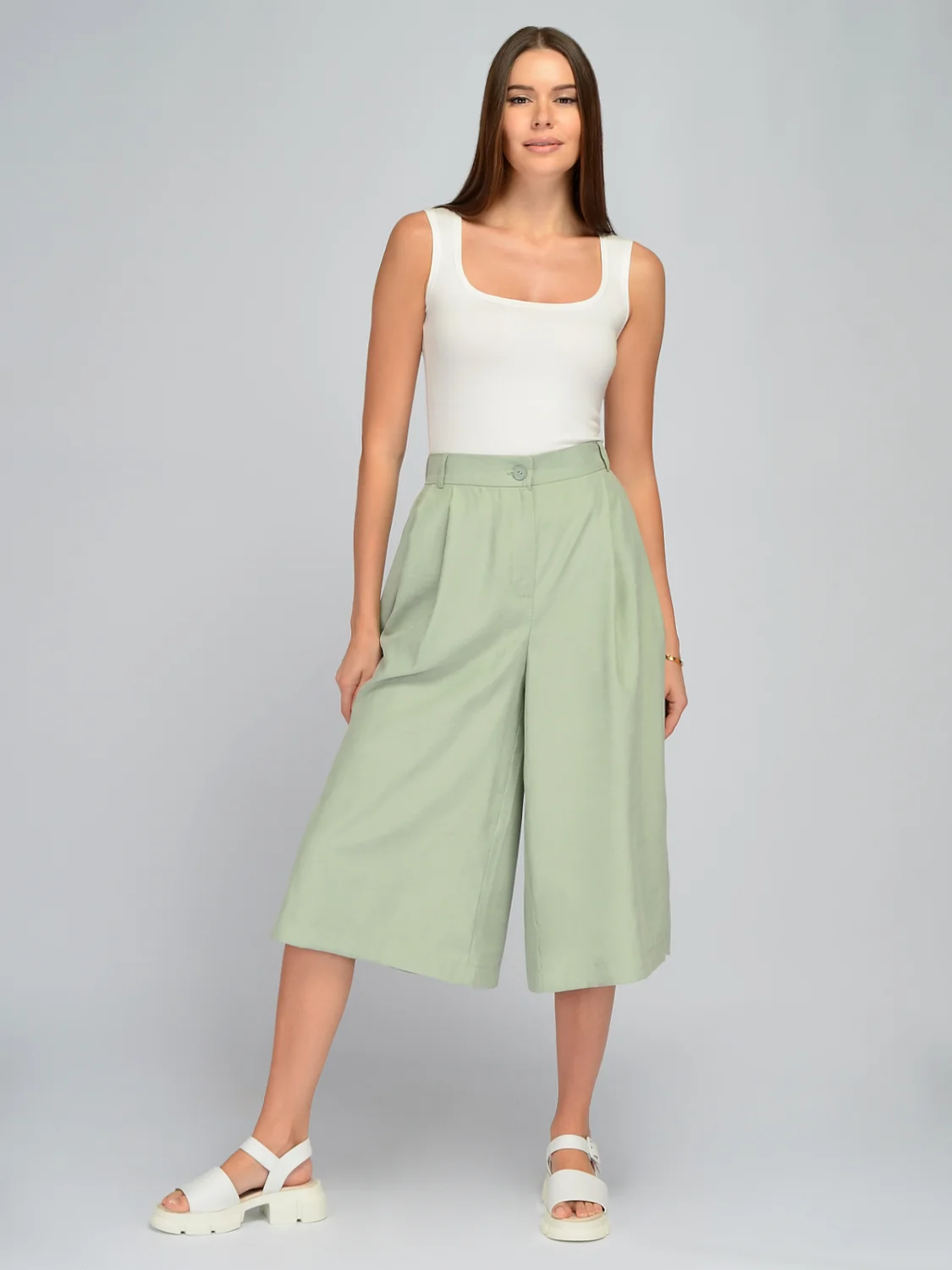 Свободные брюки ниже колена станут эффектной новинкой для летнего сезона. Брюки кюлоты имеют высокую посадку на талии, визуально делая Ваши ноги длиннее, а силуэт стройнее. В поясе находятся шлевки, поэтому не забудьте дополнить образ подходящим ремешком. Сзади в талии есть резинка, поэтому капри подстроятся под любую фигуру и идеально сядут. По бокам расположены практичные карманы, без которых сложно представить современный образ. Брючины широкого кроя создают эффект юбки и обеспечивают максимальный комфорт при ходьбе. Особенно комфортно Вы будете чувствовать себя в данной модели в жаркий день! Летние кюлоты подойдут девушкам и женщинам разного роста и телосложения. Они скроют возможные недостатки фигуры в зоне бедер, при этом подчеркнут талию. Вы можете выбрать укороченные брюки для повседневных дел, работы, праздничных событий и даже взять их с собой на отдых. Вы можете сочетать длинные шорты как с базовыми футболками, топами, босоножками или кедами, а также с классическими лодочками и блузками. Тонкий приятный материал красиво струится при ходьбе, добавляя Вашей походке легкости и женственности.