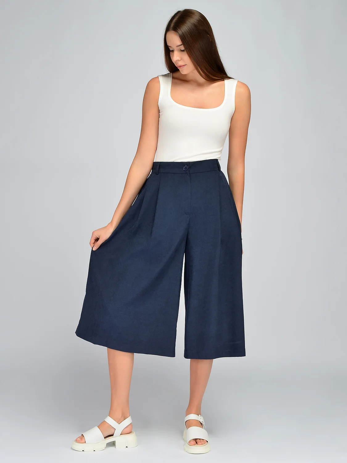 Свободные брюки ниже колена станут эффектной новинкой для летнего сезона. Брюки кюлоты имеют высокую посадку на талии, визуально делая Ваши ноги длиннее, а силуэт стройнее. В поясе находятся шлевки, поэтому не забудьте дополнить образ подходящим ремешком. Сзади в талии есть резинка, поэтому капри подстроятся под любую фигуру и идеально сядут. По бокам расположены практичные карманы, без которых сложно представить современный образ. Брючины широкого кроя создают эффект юбки и обеспечивают максимальный комфорт при ходьбе. Особенно комфортно Вы будете чувствовать себя в данной модели в жаркий день! Летние кюлоты подойдут девушкам и женщинам разного роста и телосложения. Они скроют возможные недостатки фигуры в зоне бедер, при этом подчеркнут талию. Вы можете выбрать укороченные брюки для повседневных дел, работы, праздничных событий и даже взять их с собой на отдых. Вы можете сочетать длинные шорты как с базовыми футболками, топами, босоножками или кедами, а также с классическими лодочками и блузками. Тонкий приятный материал красиво струится при ходьбе, добавляя Вашей походке легкости и женственности.