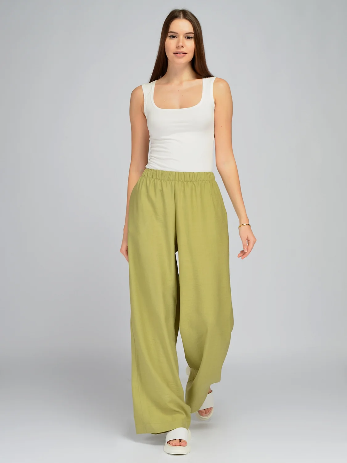 Свободные брюки палаццо станут находкой для летнего гардероба. Высокая талия с резинкой в поясе обеспечит идеальную посадку на любой фигуре и смоделирует женственный силуэт. Длинные широкие брюки скроют возможные нюансы фигуры. По бокам располагаются практичные карманы, без которых сложно представить повседневные образы. Летние брюки выполнены из приятной жатой ткани, благодаря которой Вы будете чувствовать себя комфортно на протяжении всего дня. Ткань, из которой выполнена модель, практически не мнется и элегантно струится при ходьбе, добавляя Вашей походке легкости. Базовые штаны можно носить в офис, на прогулку, в отпуске и даже на культурные и праздничные мероприятия летом. Текстильные брюки в пол придутся по вкусу модницам разного роста и комплекции, визуально вытягивая силуэт. Дополните образ топом, футболкой или блузкой, которые Вы можете надеть навыпуск или заправить за пояс. Обувь выбирайте в зависимости от повода, подойдет как строгая обувь на каблуке, так и кеды или босоножки.