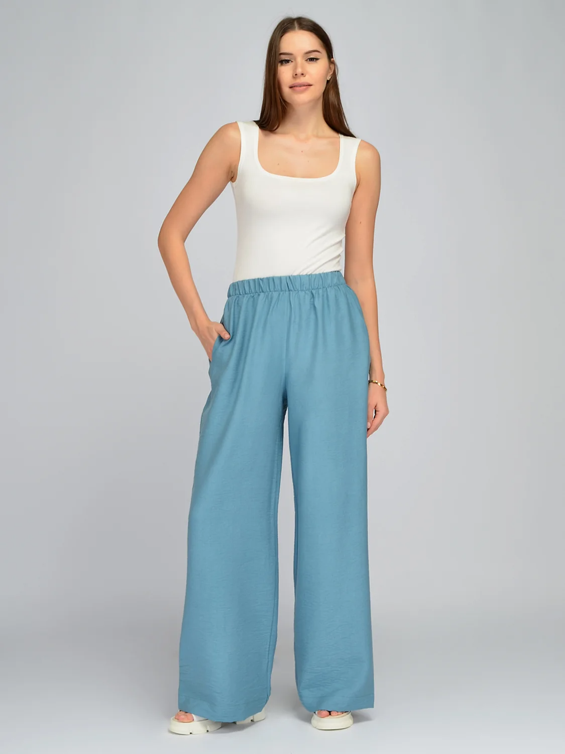 Свободные брюки палаццо станут находкой для летнего гардероба. Высокая талия с резинкой в поясе обеспечит идеальную посадку на любой фигуре и смоделирует женственный силуэт. Длинные широкие брюки скроют возможные нюансы фигуры. По бокам располагаются практичные карманы, без которых сложно представить повседневные образы. Летние брюки выполнены из приятной жатой ткани, благодаря которой Вы будете чувствовать себя комфортно на протяжении всего дня. Ткань, из которой выполнена модель, практически не мнется и элегантно струится при ходьбе, добавляя Вашей походке легкости. Базовые штаны можно носить в офис, на прогулку, в отпуске и даже на культурные и праздничные мероприятия летом. Текстильные брюки в пол придутся по вкусу модницам разного роста и комплекции, визуально вытягивая силуэт. Дополните образ топом, футболкой или блузкой, которые Вы можете надеть навыпуск или заправить за пояс. Обувь выбирайте в зависимости от повода, подойдет как строгая обувь на каблуке, так и кеды или босоножки.
