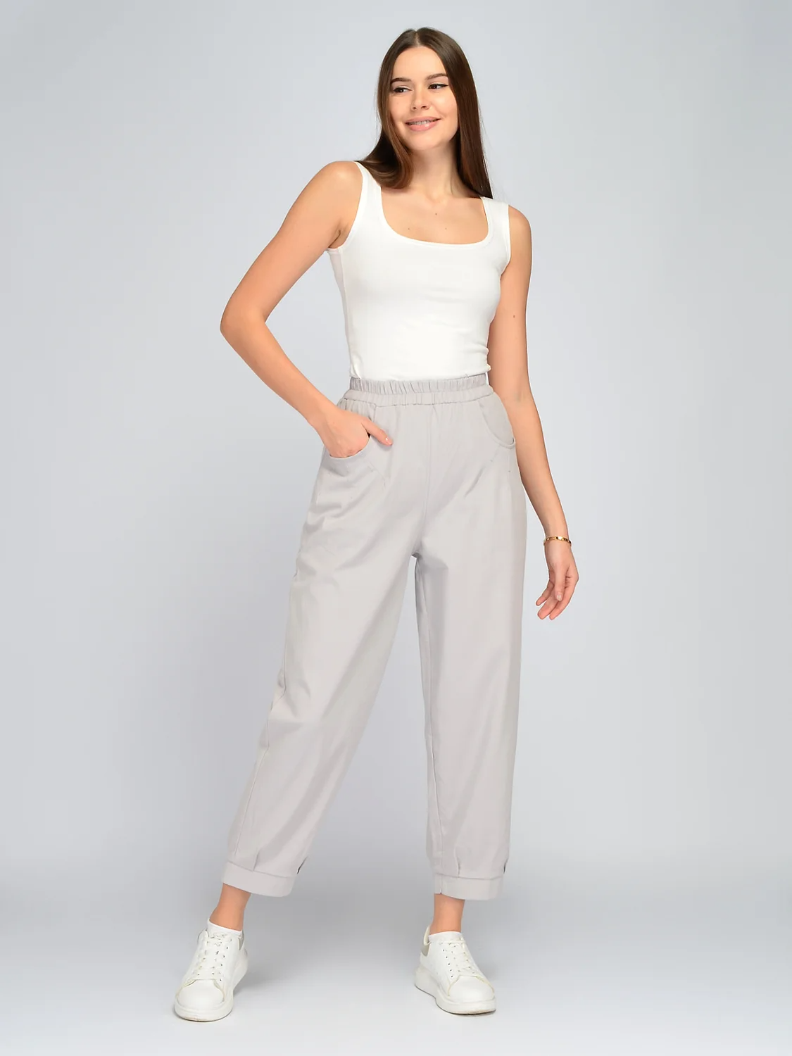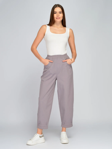Хлопковые брюки обязательно должны быть в гардеробе любой девушки летом. Высокая талия создаст гармоничные пропорции фигуры и добавит несколько дополнительных сантиметров росту. Удобный пояс на резинке не давит на живот и позволяет регулировать плотность посадки. Спереди на брюках располагаются удобные карманы. Снизу у штанов декоративные защипы. Благодаря натуральной хлопковой ткани Вы будете чувствовать себя комфортно даже в жаркий день. Материал у брюк достаточно плотный, а это значит, модель поможет скрыть небольшие недостатки в области бедер. Свободные брюки мом немного заужаются книзу и имеют длину 7/8. Укороченные модели сохранят свою актуальность к летнем сезоне. Базовые брюки бананы идеально впишутся в повседневные образы. Дополните их топом, футболкой или укороченным жакетом. Обувь выбирайте на плоском ходу, например, кеды или эспадрильи. Чтобы чувствовать себя комфортно на пикнике или в отпуске, создавайте образы из натуральных материалов. Практичные укороченные брюки без застежки станут универсальным летним вариантом!