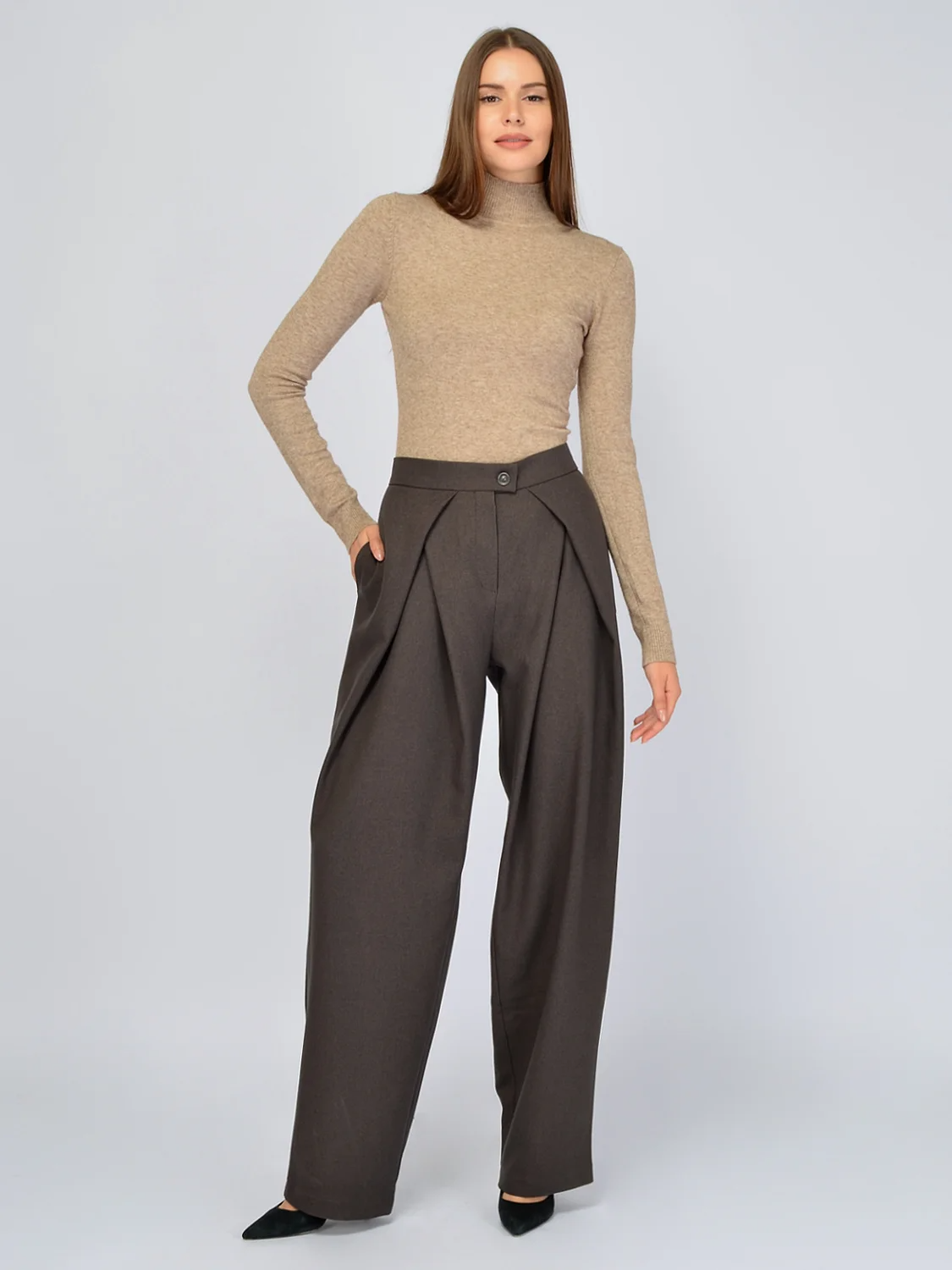 Длинные брюки в классическом стиле уже давно стали неотъемлемой частью большинства гардеробов. Чтобы выбрать идеальную модель, убедитесь, что она подчеркивает достоинства фигуры. У данной модели брюк высокая посадка на талии, а это значит, что Ваши ноги будут выглядеть длиннее, а фигура гармоничнее. Свободное облегание по всей длине поможет скрыть возможные недостатки в области бедер и сделает Вашу походку легкой и воздушной. На передней части брюк находятся декоративные складки, придающие всем образам элегантности. Кроме того, такой элемент привнесет необходимую для торжественных и культурных мероприятий изюминку и оригинальность. Строгие брюки немного сужаются книзу, формируя актуальный фасон мом или бананы. В поясе сзади предусмотрена резинка, чтобы изделие идеально село на любую фигуру и не топорщилось. По бокам находятся практичные карманы, без которых сложно представить современный образ. Уникальный крой выделит Вас в рабочей обстановке, на официальных мероприятиях или праздниках. Дополните базовые брюки водолазкой, блузкой или рубашкой, которые желательно заправить за пояс, чтобы подчеркнуть талию. Завершите образ обувью на высоком ходу, украшениями и аксессуарами!