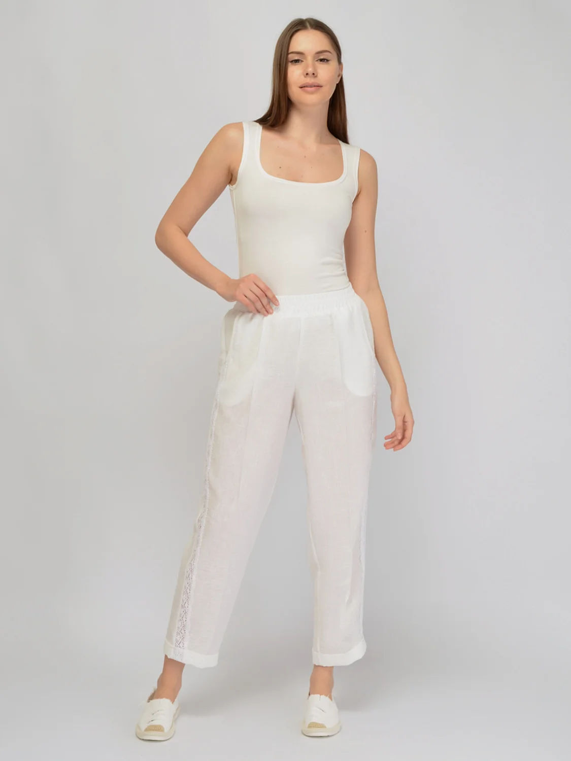 Летние брюки изо льна станут неотъемлемой частью Вашего гардероба. Удобная высокая посадка на талии обеспечивается широкой резинкой, которая не давит на живот и создает женственные пропорции фигуры. Легкие брюки бананы оснащены функциональными карманами спереди и сзади для удобства при ежедневной носке. Отличительной особенностью укороченных брюк являются эффектные кружевные вставки по бокам. Льняные брюки с лампасами украсят повседневные образы для города и загородных прогулок. Благодаря натуральной ткани Вы будете чувствовать себя комфортно на протяжении всего дня. Базовые свободные брюки с отворотами подойдут как молодым девушкам, так и взрослым женщинам. Свободные штаны до щиколотки легко комбинируются с элементами кэжуал стиля. К модели идеально подходит жакет на пуговицах из нашей коллекции. Завершите образ удобной обувью на плоском ходу. Поскольку брюки в светлой расцветке могут немного просвечивать, мы рекомендуем выбирать под них белье телесного оттенка.