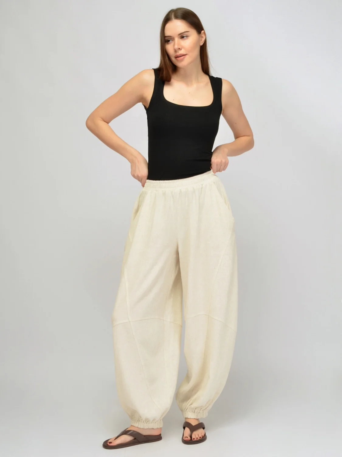 Свободные летние брюки станут Вашими любимцами в жаркий сезон. Талия и манжеты на резинке обеспечат правильную посадку по фигуре и сохранят объемную форму брюк алладинов. Высокая посадка визуально вытягивает силуэт, делая Вас выше. Просторные брюки бананы не облегают бедра и ноги, скрывают возможные недостатки фигуры. Длинные летние брюки имеют карманы по бокам и сзади, обеспечивая комфорт современной девушке. Модель широких брюк имеет оригинальные асимметричные строчки, делая модель уникальной и притягательной. Легкие брюки выполнены из приятной натуральной ткани с большим процентом вискозы в составе, благодаря чему вы будете чувствовать себя комфортно и свободно на протяжении всего дня. Идеальные летние брюки алладины дополнят стильные повседневные образы. Завершите образ топом или футболкой и наденьте удобную обувь на низком ходу. Объемные брюки шаровары станут отличным дополнением гардероба для отпуска и отдыха на море.